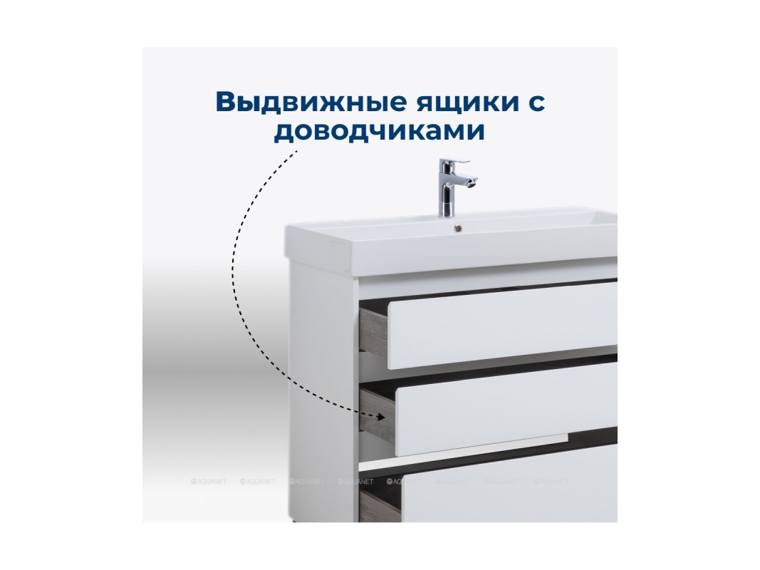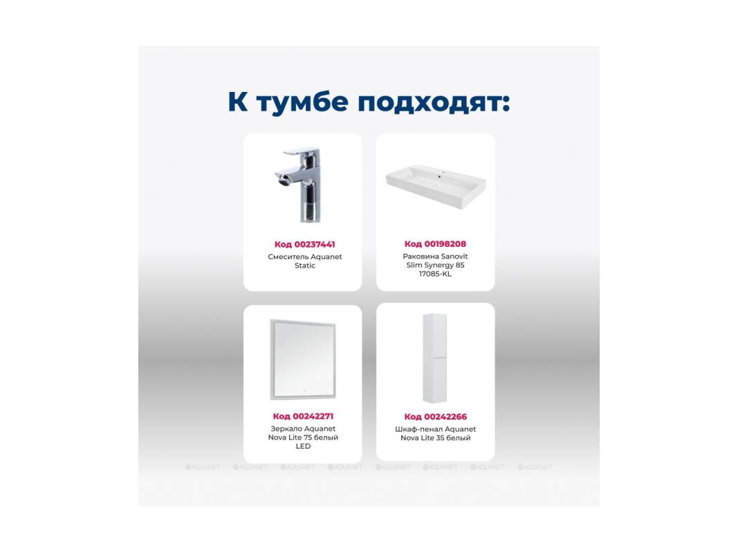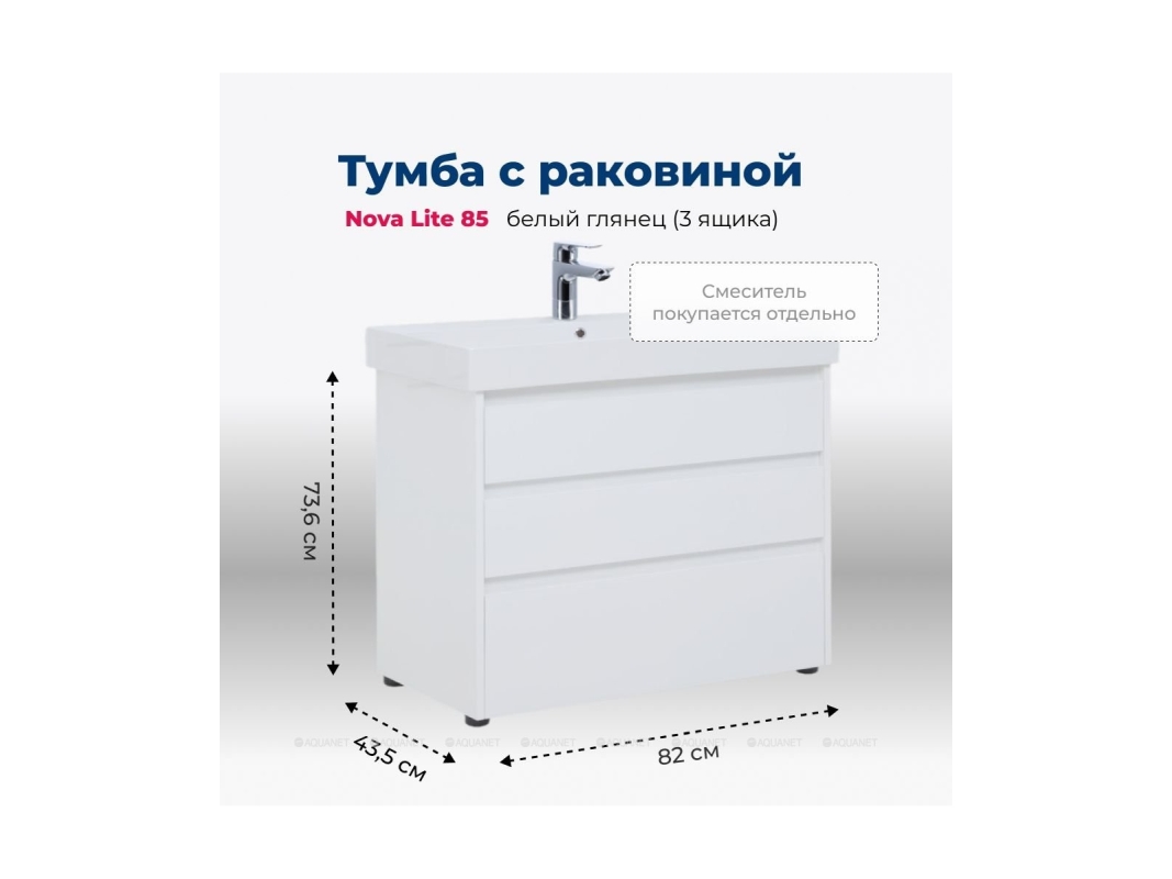 Тумба с раковиной Aquanet Nova Lite 85 в белом глянцевом исполнении — идеальный вариант для дополнения ванной комнаты в любом из современных стилей. Лаконичный дизайн с претензией на натуральность позволяет освежить санузел смелым решением. Компактные размеры 820*736*435 мм подойдут как для малых помещений, так и для просторных. Напольная модель оснащена ножками и тремя выдвижными шкафами. Пространство внутри организовано для хранения вещей и бытовой химии с учетом коммуникаций для водоотведения. Корпус и фасад мебели изготовлены из влагостойкого ЛДСП, который препятствует образованию плесени и грибка при длительном взаимодействии с водой и влажным воздухом. Выдвижные шкафы оснащены механизмом доведения, что обеспечивает плавное закрытие. В комплект к тумбе можно купить подходящую по размерам керамическую раковину от Sanovit, например модель Slim Synergy, которая легко подсоединяется к мебели.