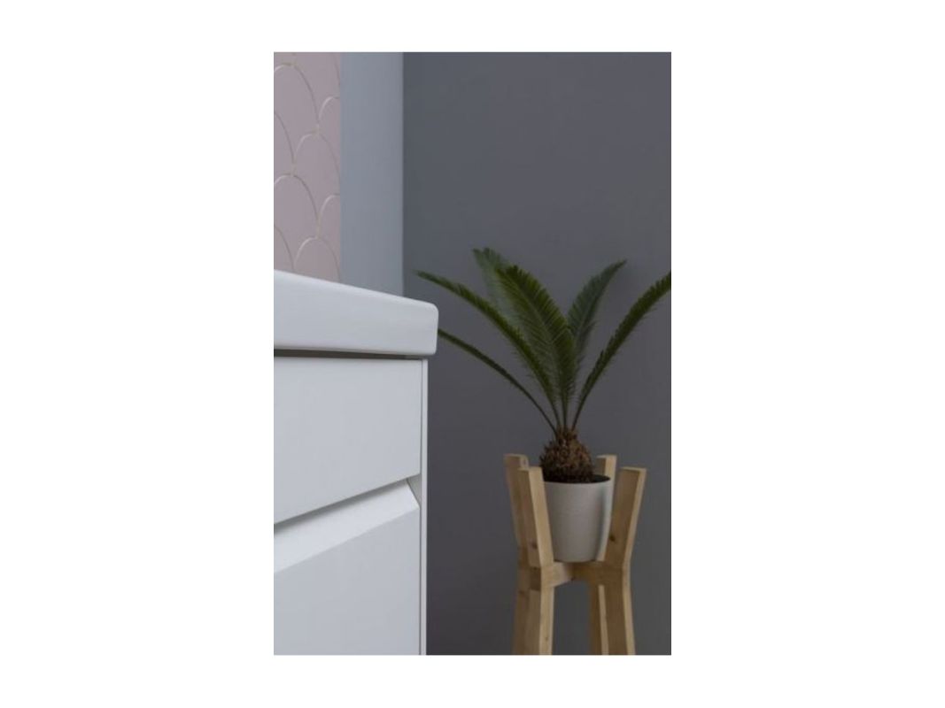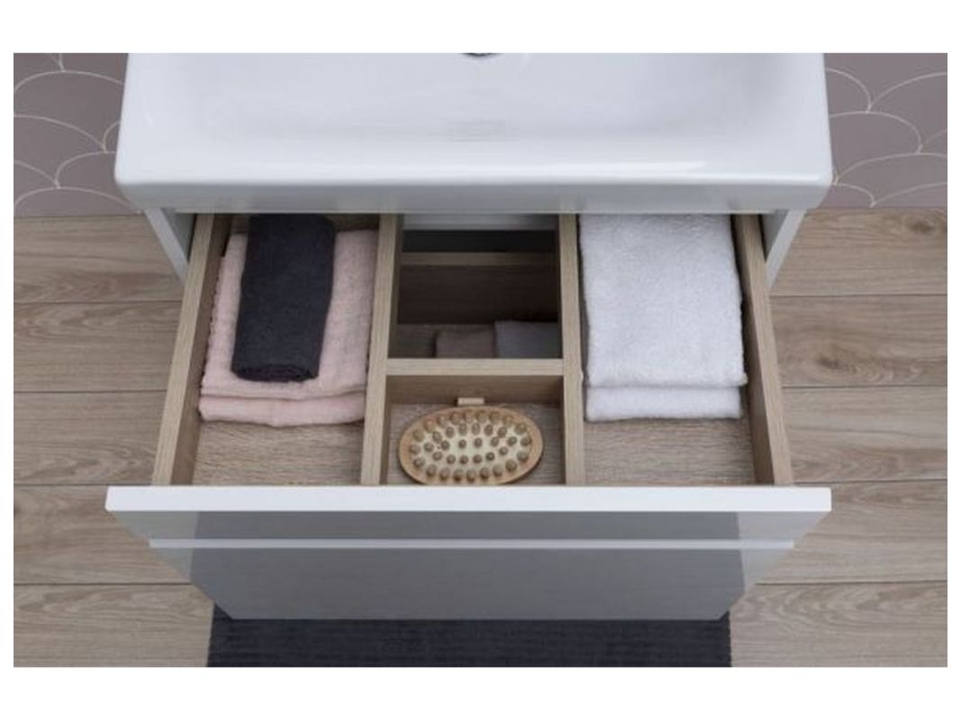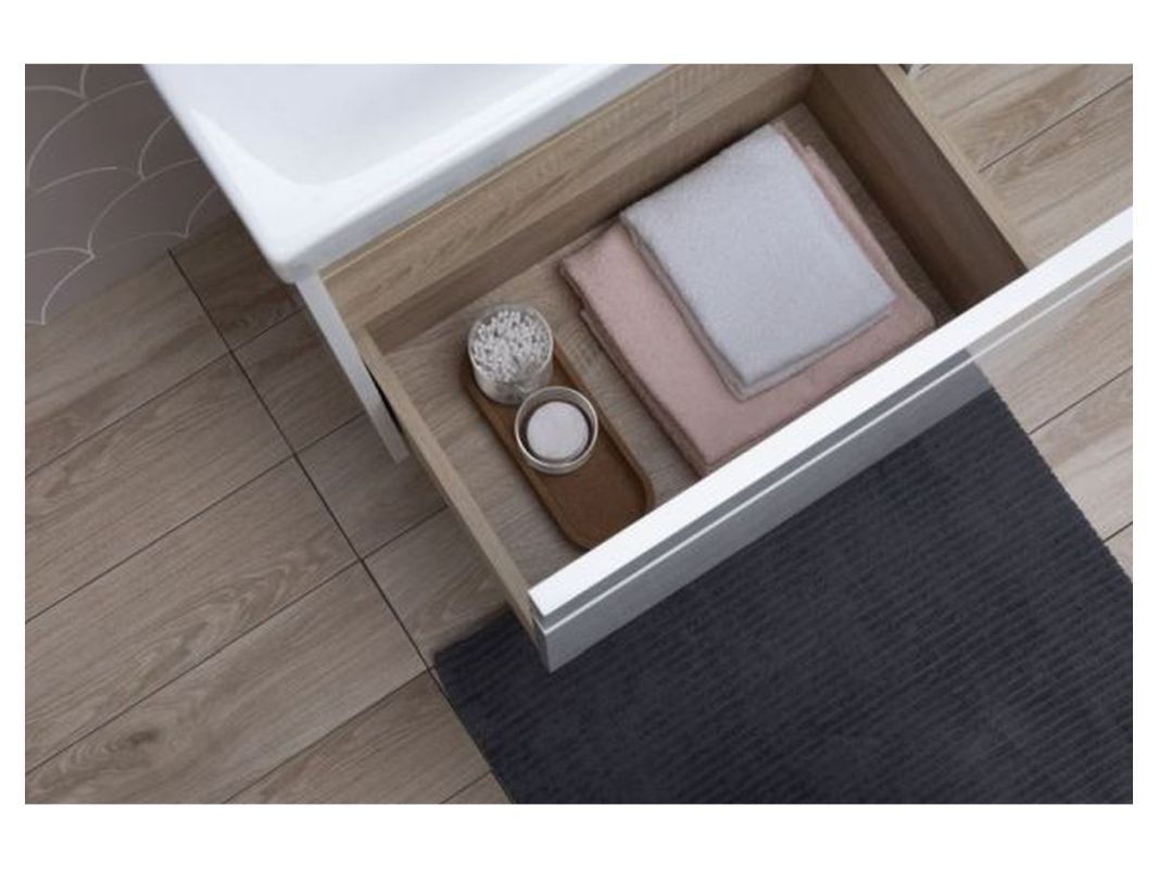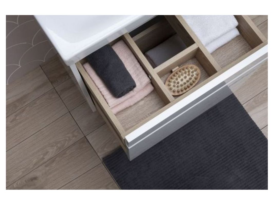 Тумба с раковиной Aquanet Палермо белого цвета шириной 60 см с корпусом из влагостойкого ЛДСП интересен в первую очередь игрой деталей. Так, полоса глубокой фрезеровки на фасаде - это вовсе не декоративная деталь, как может показаться на первый взгляд, а удобная интегрированная ручка - модный мебельный тренд. А фасадов не два, как видится сначала, а всего один, и это внешняя деталь одного выдвижного ящика. Второй ящик тоже есть, но он скрывается внутри. Неглубокий, но сегментированный на три секции, что особенно придется по вкусу женщинам, так как в них можно разместить столько полезных мелочей. Тумба предлагается в комплекте с удобной керамической раковиной с узкими бортиками, которая устанавливается в один уровень с корпусом, что смотрится одновременно и просто, и красиво.