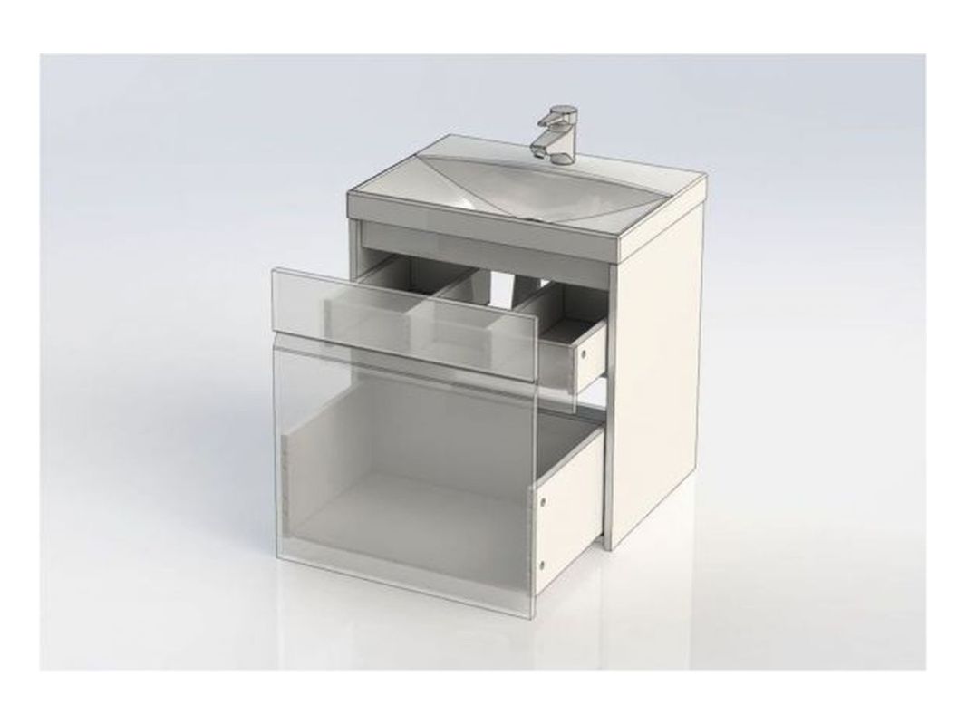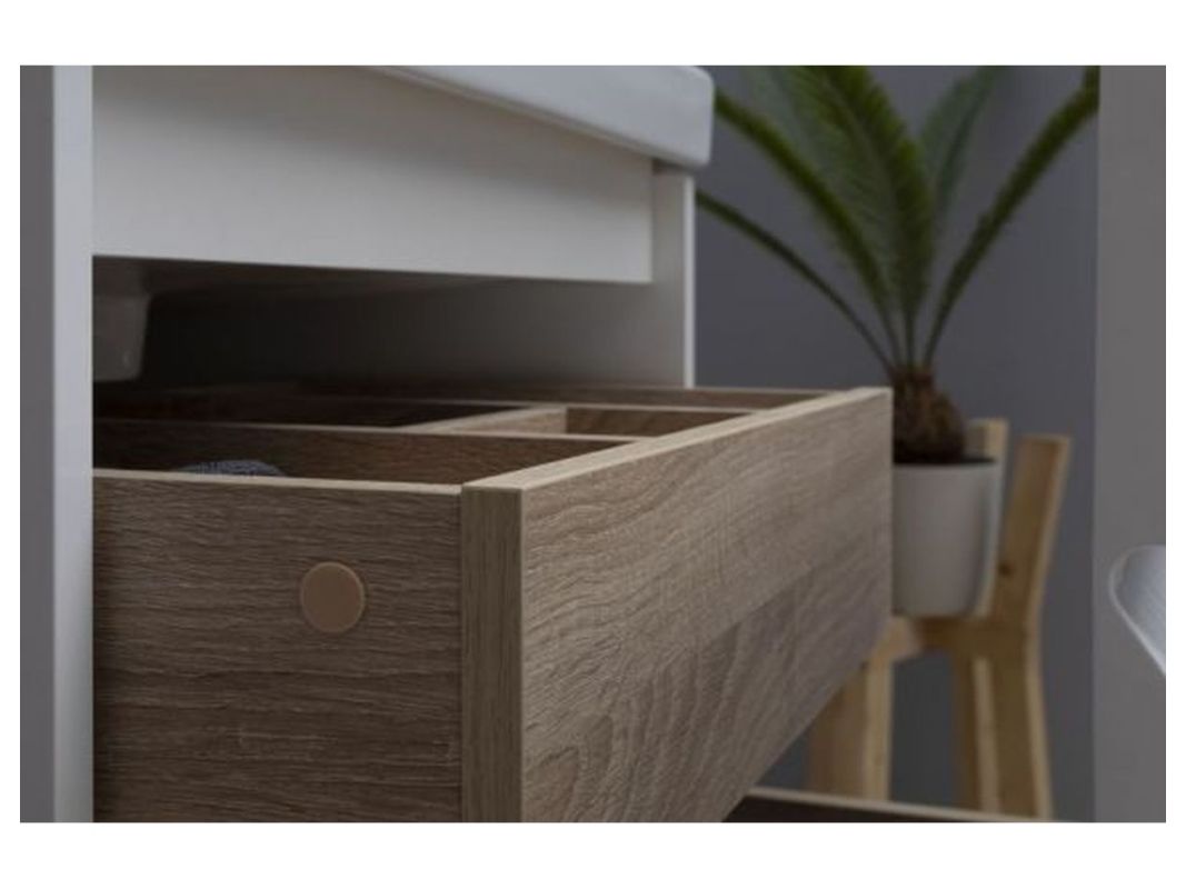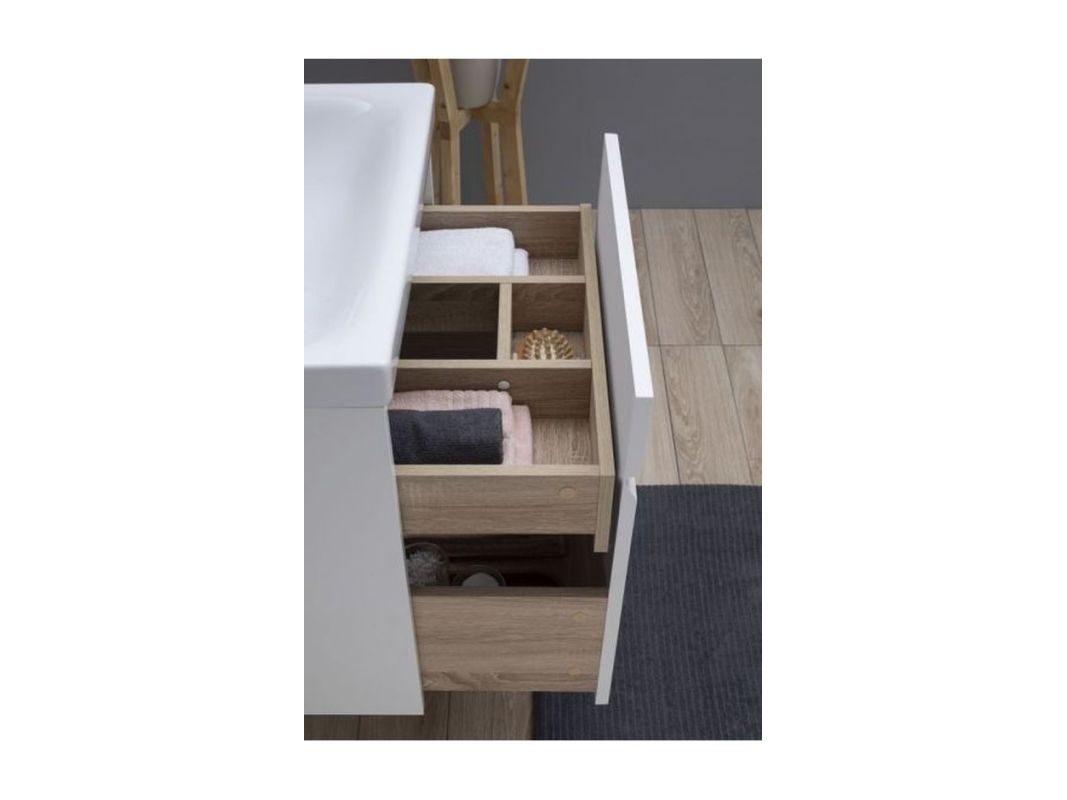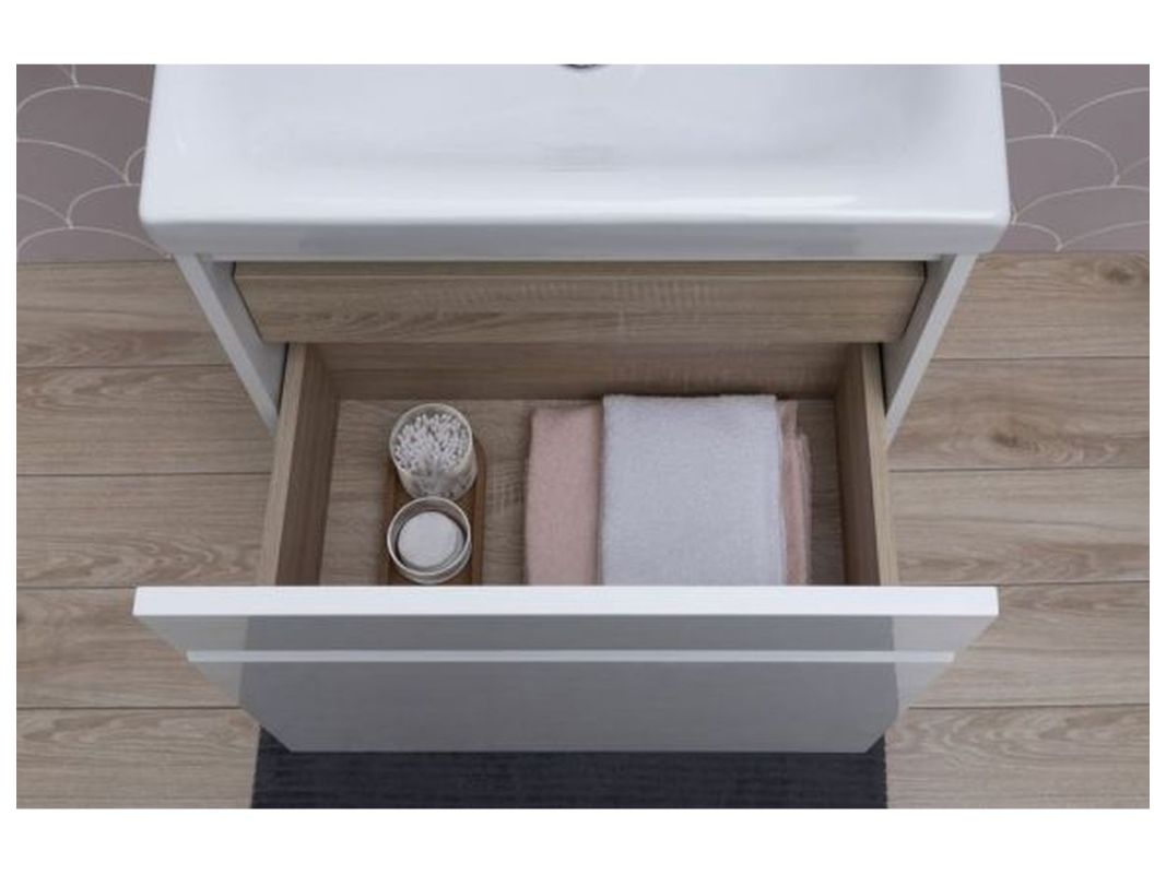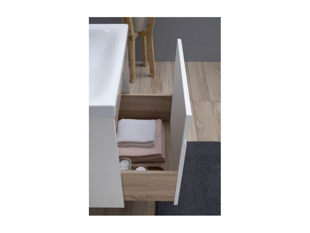 Тумба с раковиной Aquanet Палермо белого цвета шириной 60 см с корпусом из влагостойкого ЛДСП интересен в первую очередь игрой деталей. Так, полоса глубокой фрезеровки на фасаде - это вовсе не декоративная деталь, как может показаться на первый взгляд, а удобная интегрированная ручка - модный мебельный тренд. А фасадов не два, как видится сначала, а всего один, и это внешняя деталь одного выдвижного ящика. Второй ящик тоже есть, но он скрывается внутри. Неглубокий, но сегментированный на три секции, что особенно придется по вкусу женщинам, так как в них можно разместить столько полезных мелочей. Тумба предлагается в комплекте с удобной керамической раковиной с узкими бортиками, которая устанавливается в один уровень с корпусом, что смотрится одновременно и просто, и красиво.