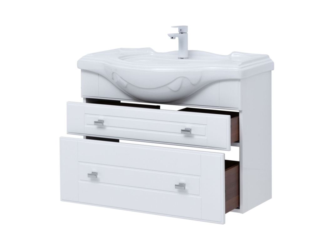 Тумба с раковиной Aquanet «Рондо» 85 в белом глянцевом корпусе оснащена двумя ящиками, обладающими разной высотой. Их можно использовать как для хранения гигиенических и косметических средств, так и для размещения порошков, гелей и кондиционеров для белья. На фронтальных панелях встроены аккуратные хромированные ручки прямоугольной формы.