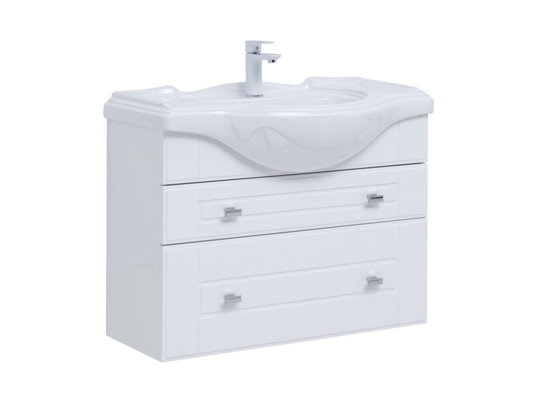 Механизм доводчика позволяет дверцам закрываться плавно и не хлопать. Раковина Aquanet Yatao 85 YB-1085 сделана из керамики в классическом стиле. По периметру расположен бортик, не позволяющий мыльнице или стакану с щеткой и пастой падать на пол или в ванную. Габариты — 850х330х602 мм.