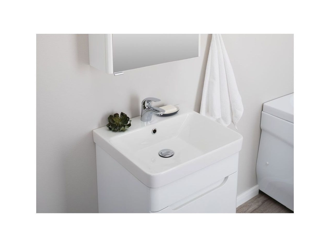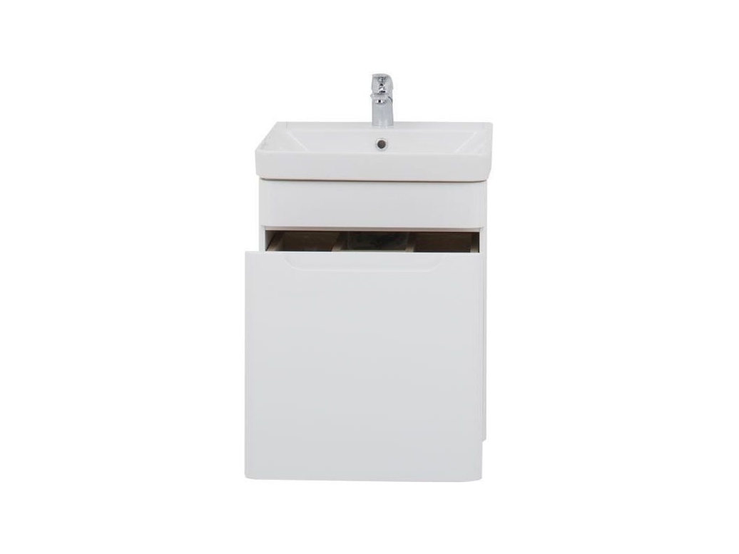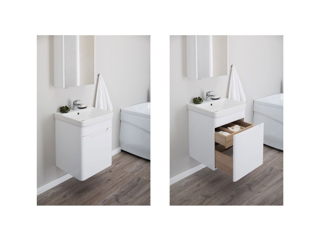 Тумба с раковиной Aquanet София 50 белого цвета состоит из изделий, где все детали продуманы до мелочей. Простая форма прямоугольника - в основе подвесной тумбы, элегантно закругленные углы - для эстетичности и в целях безопасности, керамическая раковина, составляющая внешне единое целое с тумбой, многокомпонентная зона хранения, которая, несомненно, порадует рачительных хозяев. Для исполнения корпуса изделия использован влагостойкий ЛДСП, выкрашенный белой краской, фасады - из МДФ, внутренние ящики - ВЛДСП в цвете дуб сонома. Глянцевые поверхности выглядят безупречно. Конструкция внутреннего устройства тумбы шириной 50 см представляет собой большой выдвижной ящик, внутри которого предусмотрен еще один, небольшой, с тремя отделениями для размещения различных мелочей. Интегрированная ручка удобна в использовании, при этом выглядит элегантно и лаконично. <