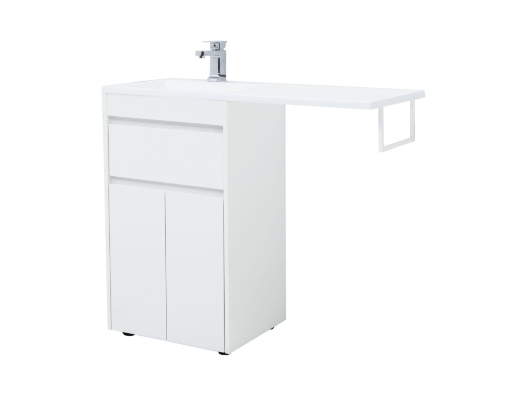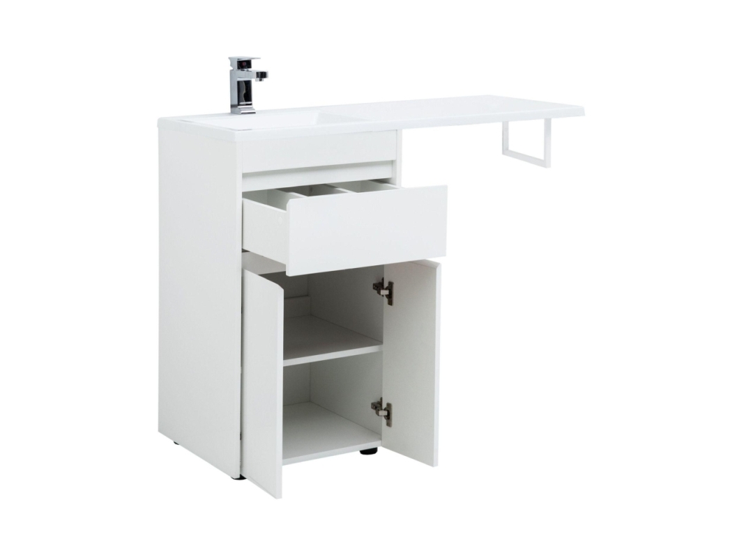 Тумба с раковиной Aquanet Токио 110 (напольная, 1 ящик, 2 дверцы) белого цвета представляет новый формат тумб производства Aquanet. Раковина из литьевого мрамора имеет длинную платформу, которая выходит далеко за пределы тумбы. Она предназначена для того, чтобы установить с правой стороны от тумбы стиральную машину. Платформа имеет такую длину, которая позволит спрятать под нее машинку средних размеров с фронтальной загрузкой. Корпус тумбы выполнен из влагостойкого ЛДСП, а фасады – из МДФ с покрытием эмалью. Разнообразные зоны хранения в тумбе шириной 480 мм скрыты в ящике и за распашными дверками. Тумбу можно использовать и без соседства со стиральной машиной, а свободное пространство под платформой раковины занять подкатной тумбой, приспособлениями для уборки помещения или столиком. Тумба предлагается без раковины