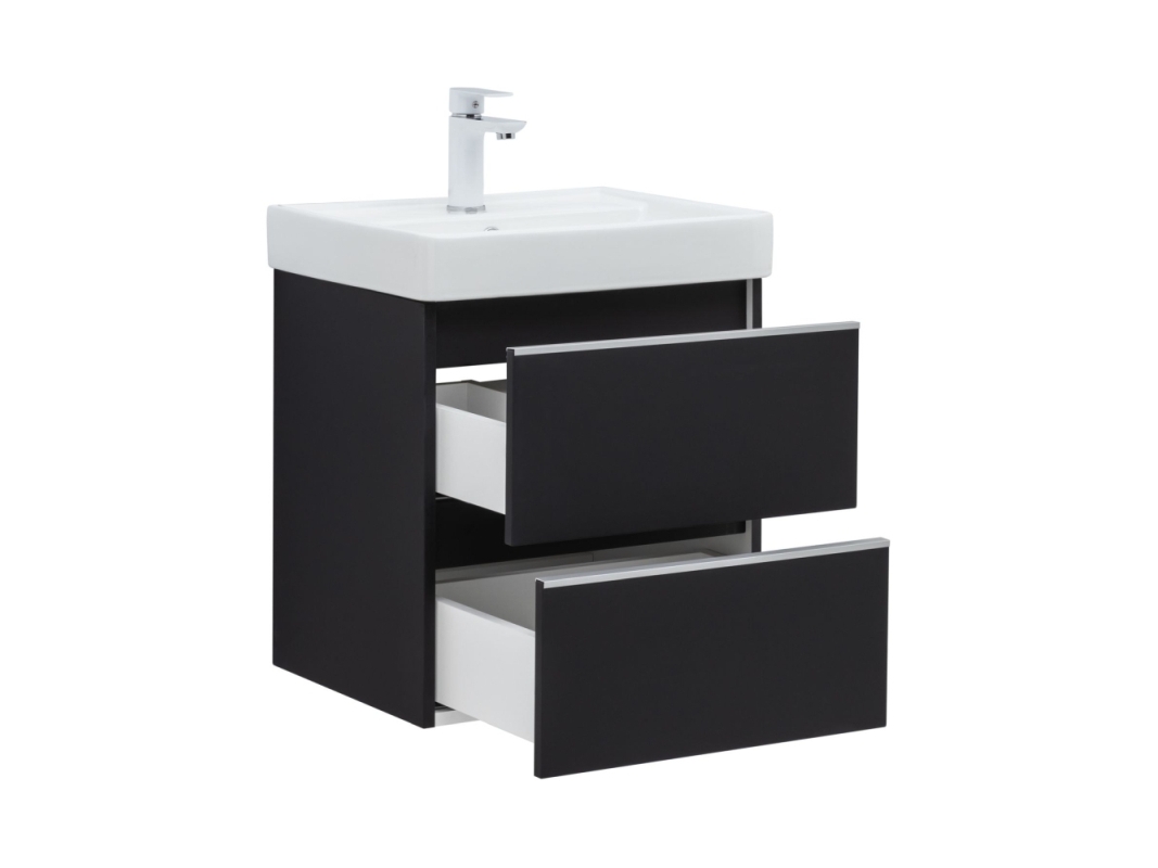 На верхние торцы фасадов дополнительно установлен защитный металлический профиль в цвете серебро. Тумба под раковину Aquanet Вега 50 черный предлагает не только стильное исполнение, но и практичность в использовании.