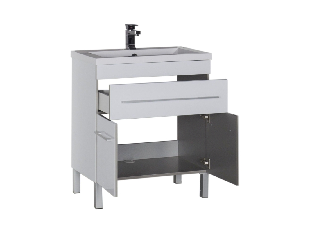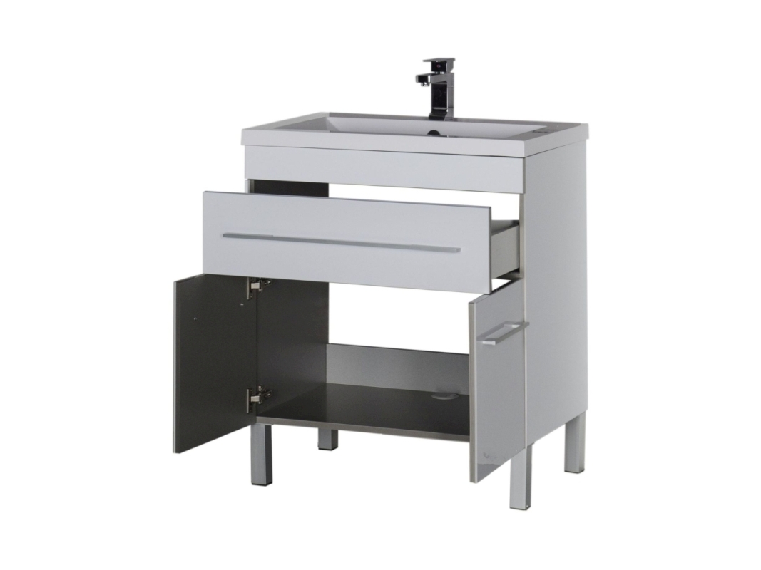 Тумба напольная с раковиной серии Верона с покрытием из качественного акрила — такая отделка придает эффектности внешнему виду и повышает уровень влагозащиты. Применение акрила в производстве мебели для ванных — уникальное предложение, созданное на специализированной линии предприятия. Нейтральный цвет универсален, потому мебель Верона можно совмещать с любыми оттенками в интерьере и разнообразием креативных идей. Экстравагантная геометричность формы подчеркнута горизонтальными линиями фурнитуры ручек выдвижных ящиков. Их вместительное пространство обеспечит дополнительное место хранения банных принадлежностей.