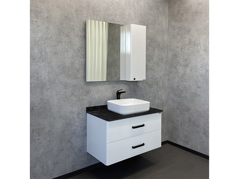 Подвесная тумба-умывальник в современном стиле с двумя широкими выкатными ящиками. Ящики оснащены системой с плавным закрыванием. Тумба укомплектована столешницей и бортиком из керамогранита под мрамор Калакатта Блэк и накладной прямоугольной раковиной.