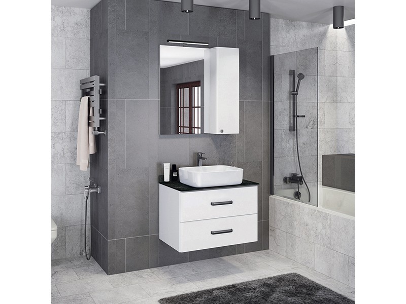 Тумба изготовлена из белого влагостойкого ДСП, фасады из МДФ окрашены белой глянцевой эмалью.