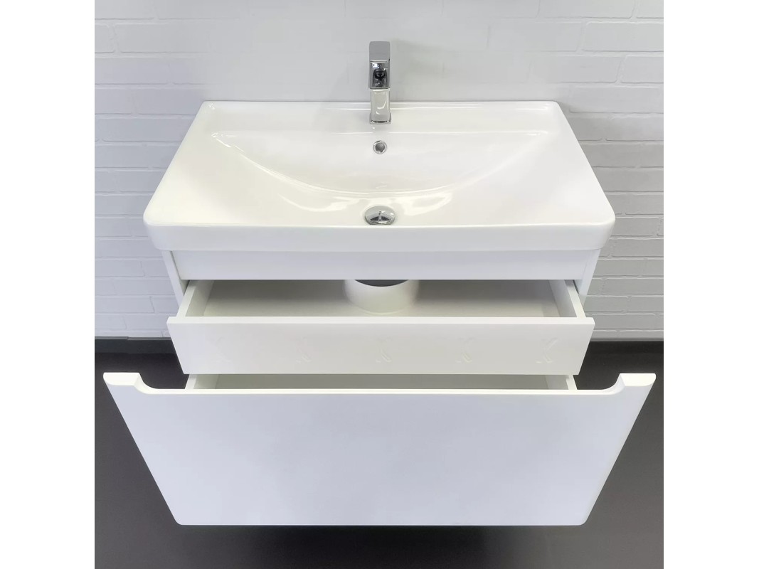 Подвесная тумба с одним большим выдвижным ящиком и внутренним ящиком для мелочей. Направляющие ящиков оборудованы системой плавного закрывания. Лицевая фурнитура на фасад отсутствует, для открытия ящика нужно потянуть верхний край фасада, на котором сделан вырез под естественный хват. Внутренний ящик оборудован push-to-open - открытие при нажатии. Тумба подготовлена для подключению коммуникаций снизу и сзади.