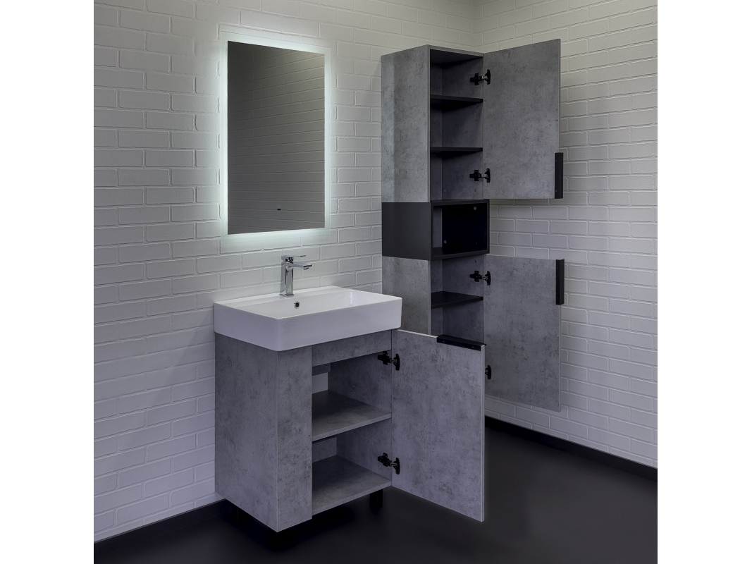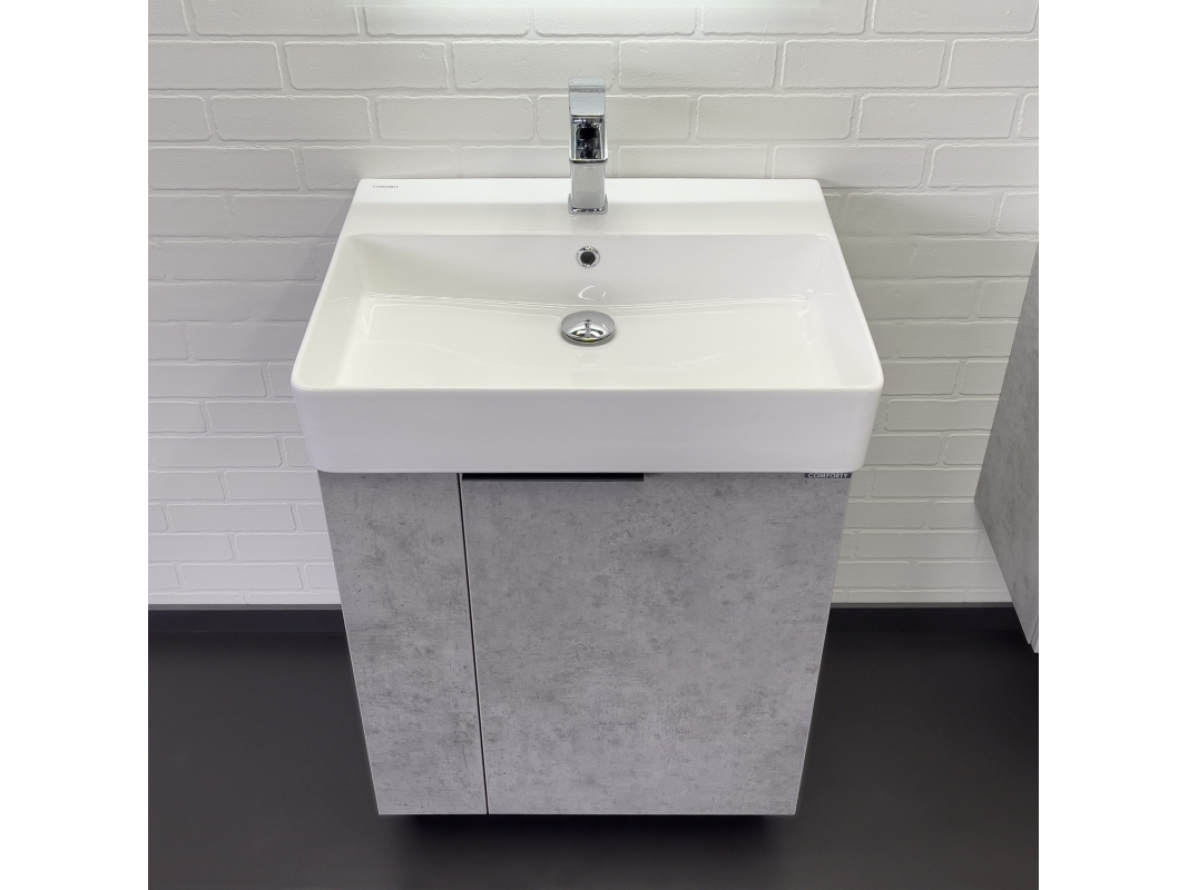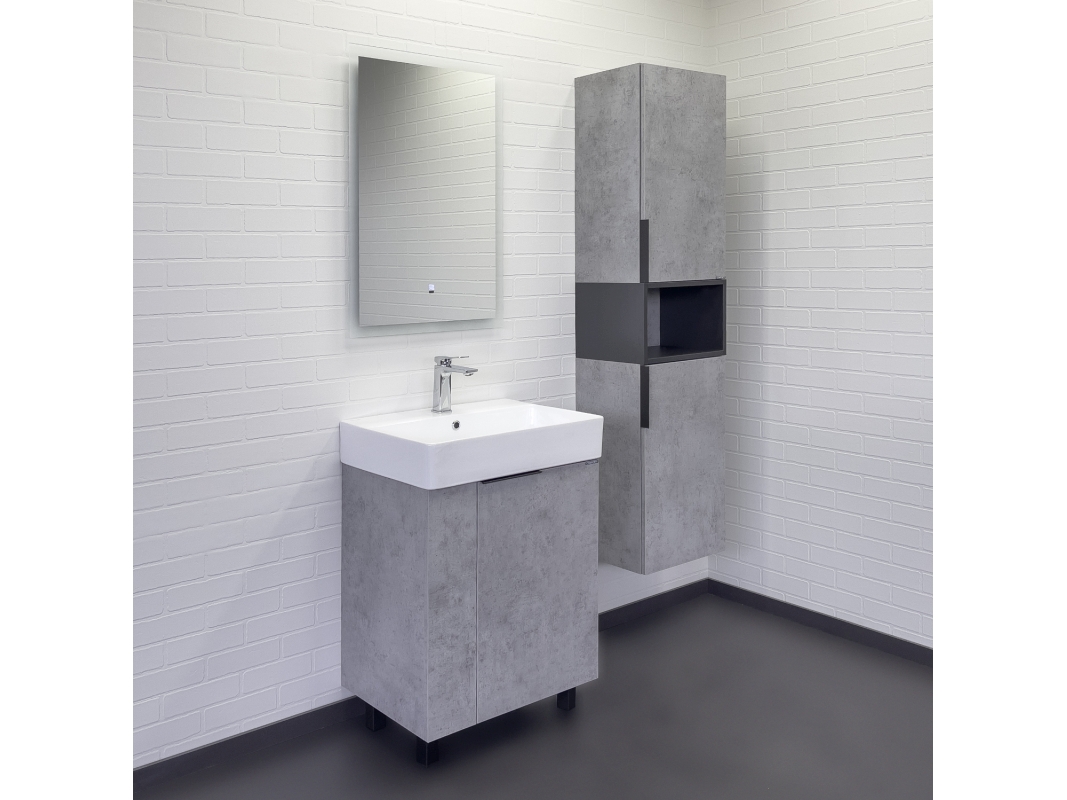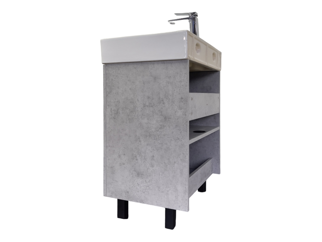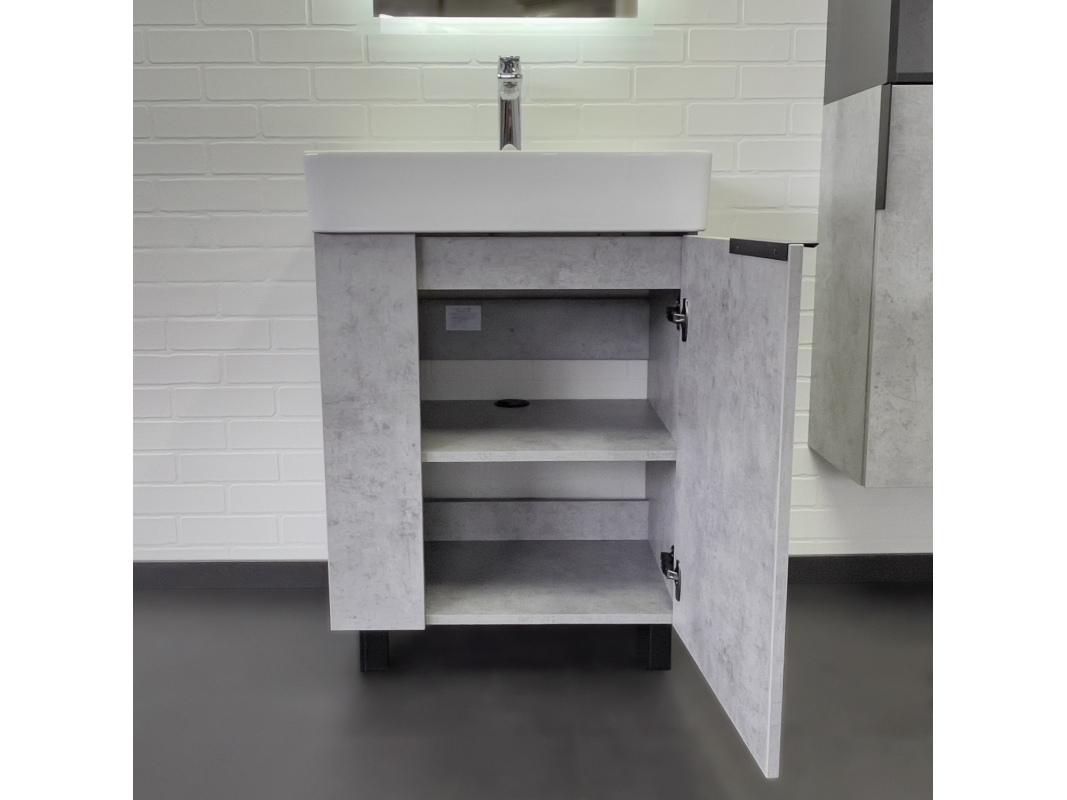 Напольная тумба с распашной дверцей. Петли оснащены системой плавного закрывания. За дверцей одна горизонтальная полка. Корпус и фасад изготовлены из влагостойкой ЛДСП в декоре бетон светлый. В комплекте прямоугольная раковина с отверстием под смеситель. Тумба подготовлена для подключения водоснабжения снизу.