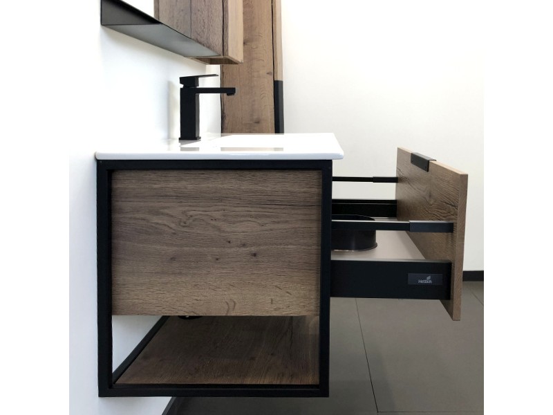 Подвесная тумба-умывальник из влагостойкого ЛДСП дуб темный с одним выкатным ящиком оснащенным системой плавного закрывания и нижней полкой открытого хранения.