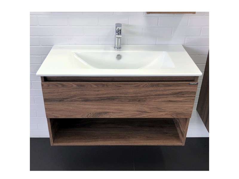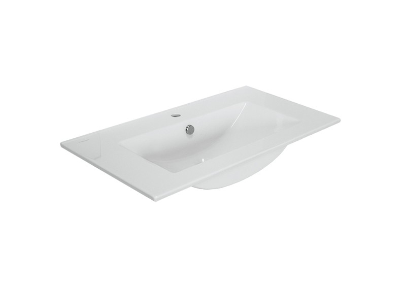 Тумба-умывальник в современном стиле с широким ящиком и пространством для открытого хранения. Ящик оснащен направляющими с механизмом плавного закрывания. Тумба укомплектована накладной прямоугольной раковиной из санфарфора.