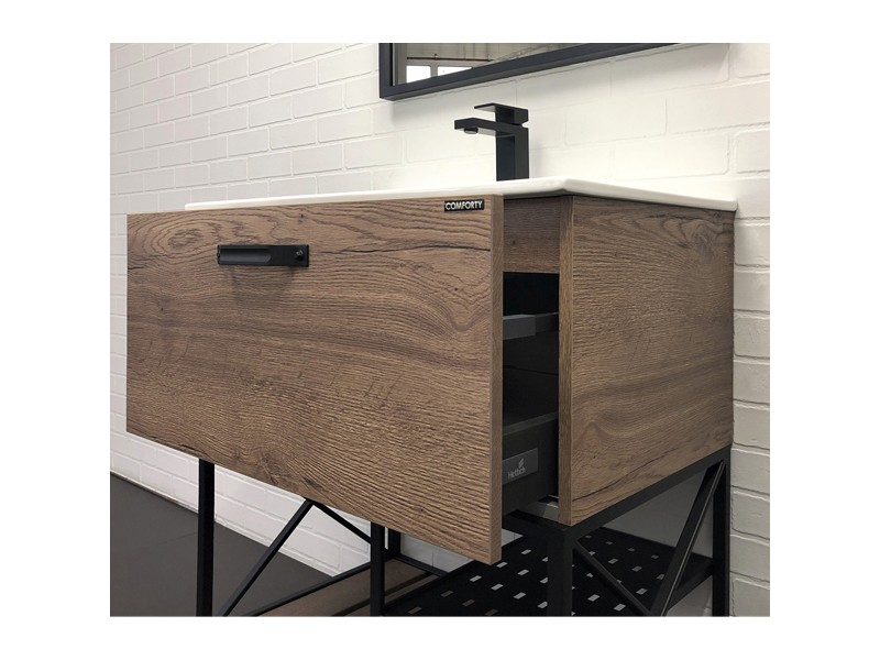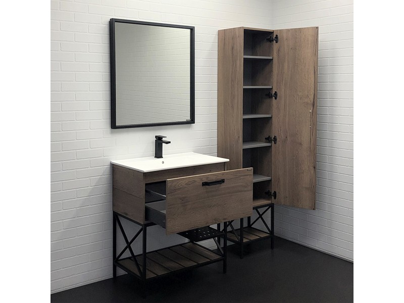 В комплекте белая раковина с прямоугольной чашей. В основе тумбы - каркас из стального профиля окрашенный черной эмалью с нижней широкой полкой и средней полкой для полотенец. Стильная ручка ящика в том же цвете что и каркас. Тумба подготовлена для подключения водоснабжения снизу.
