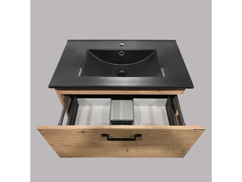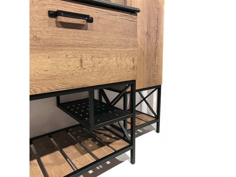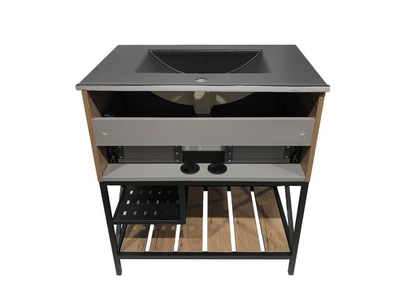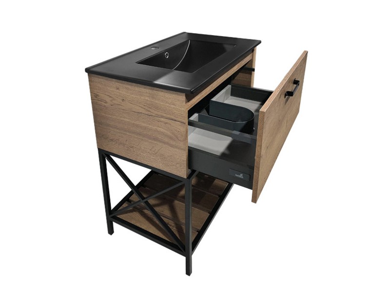 В комплекте черная матовая раковина с прямоугольной чашей. В основе тумбы - каркас из стального профиля окрашенный черной эмалью с нижней широкой полкой и средней полкой для полотенец. Стильная ручка ящика в том же цвете что и каркас. Тумба подготовлена для подключения водоснабжения снизу.