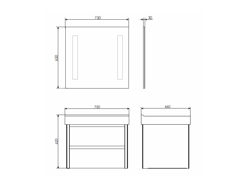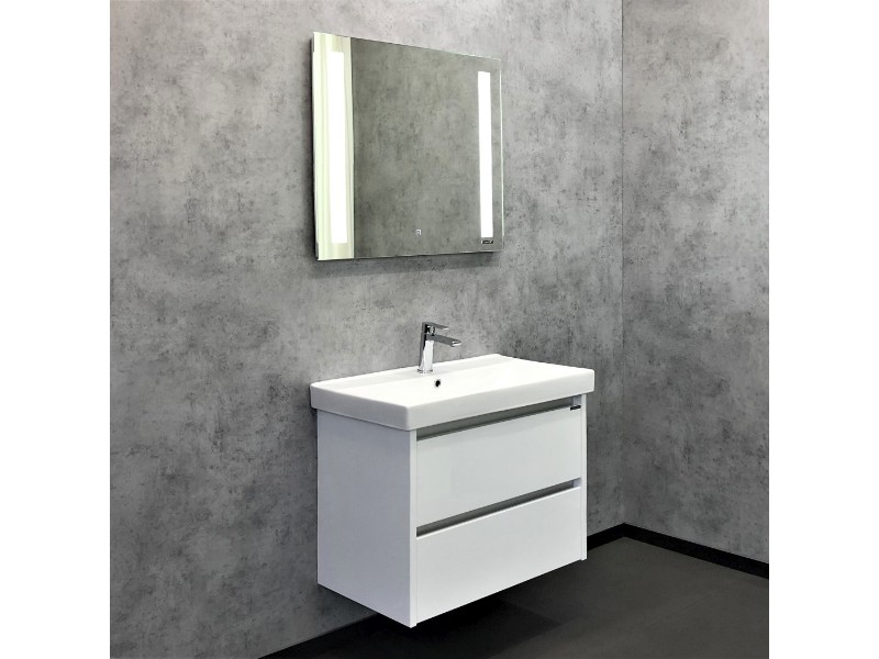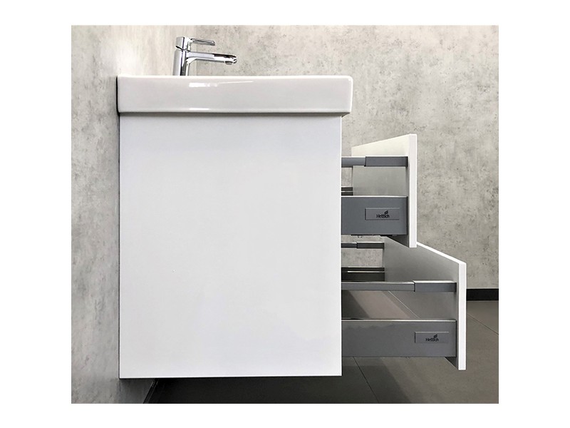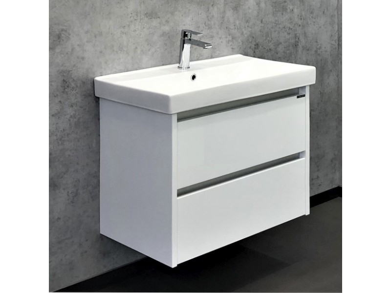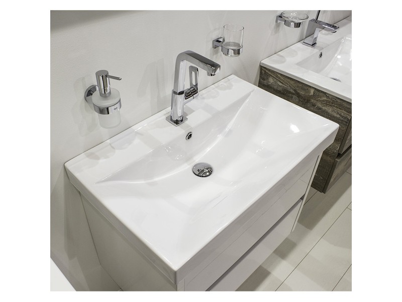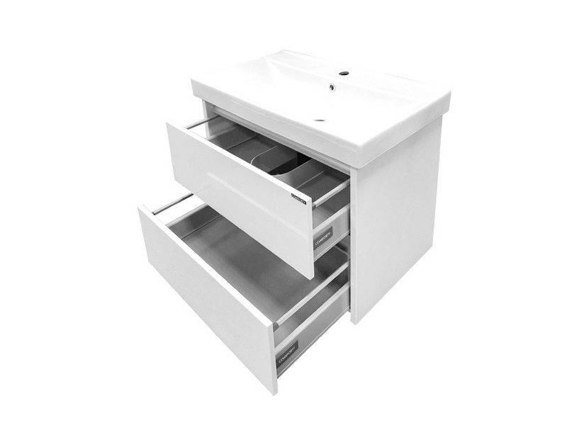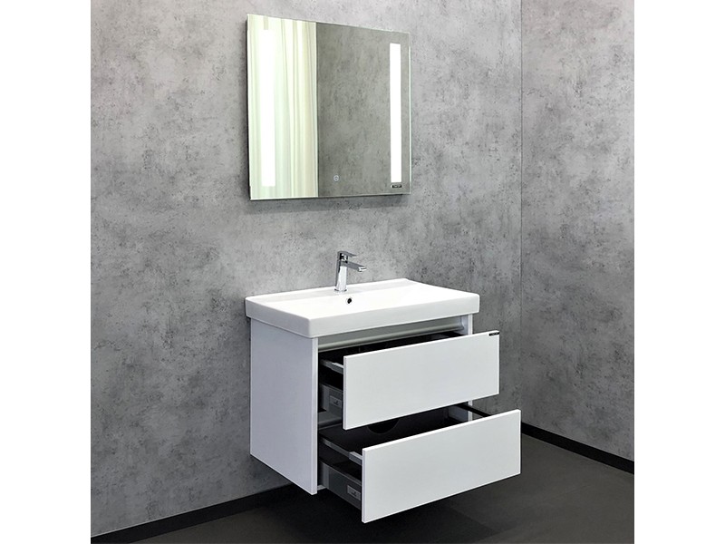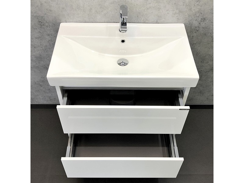 Современная подвесная тумба-умывальник. Модель шириной 75 см оборудована двумя вместительными выкатными ящиками. Направляющие ящиков оборудованы системой плавного закрывания. Тумба подготовлена для подключения водоснабжения снизу.