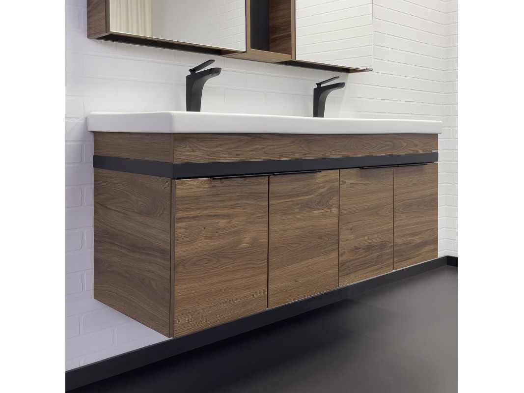Подвесная тумба-умывальник на две чаши для большой ванной комнаты. Для сохранения геометрических размеров конструкция тумбы усилена металлической рамой окрашенной в цвет черный муар.
