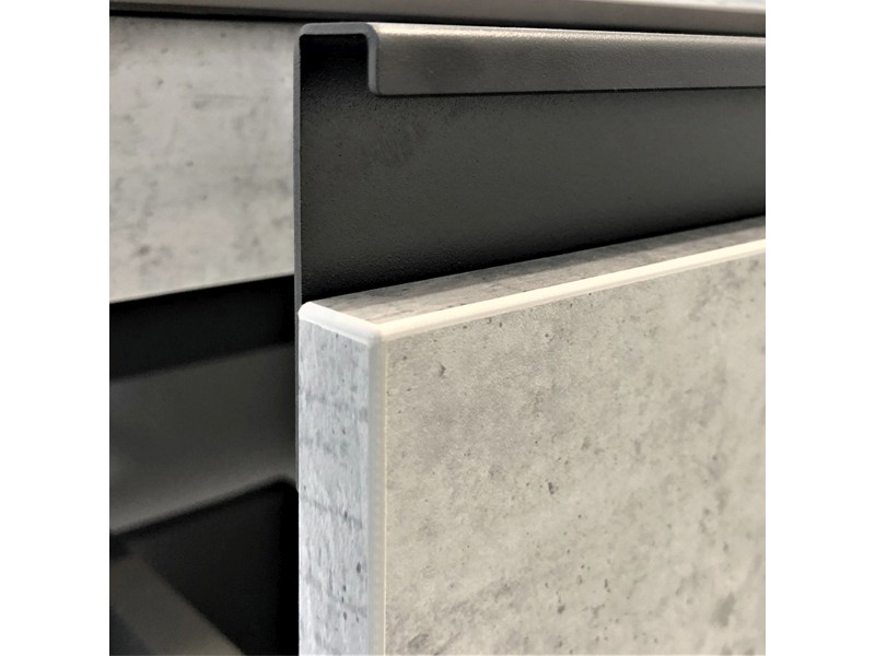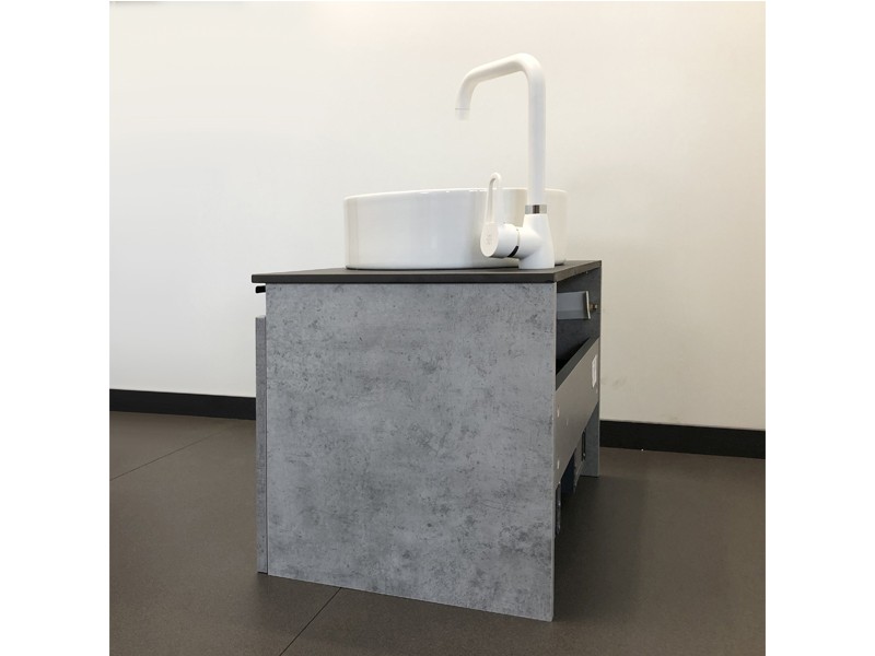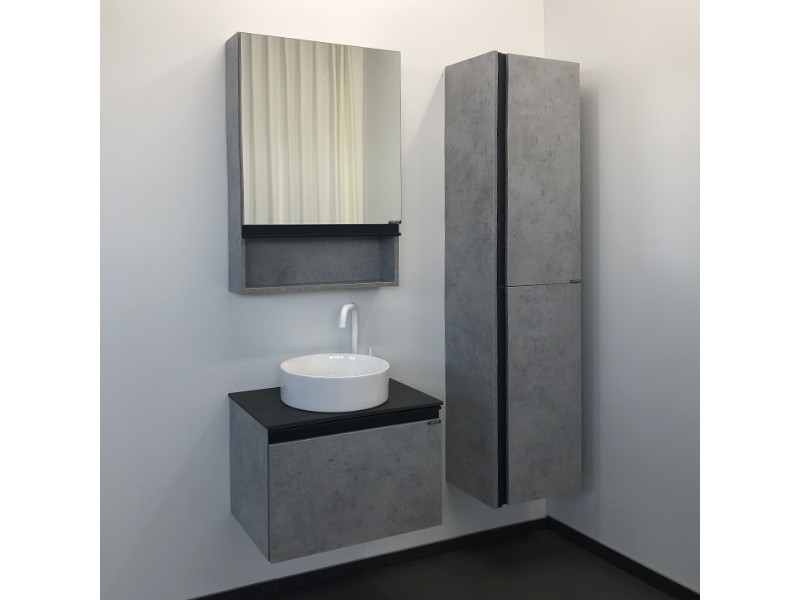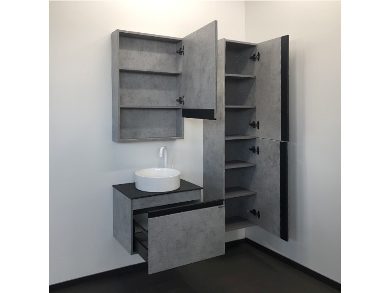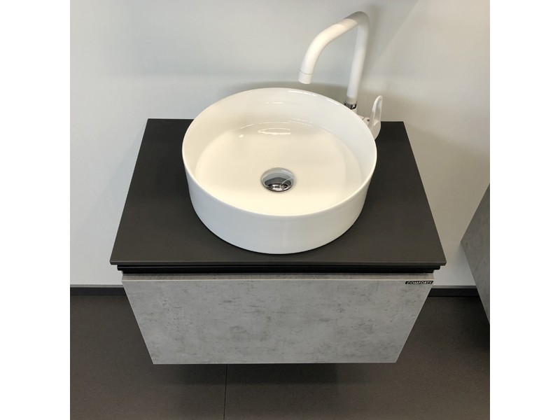 Тумба-умывальник в современном стиле с глубоким выкатным ящиком. Ящик оснащен системой плавного закрывания. Тумба укомплектована черной матовой ручкой-профилем, столешницей из черного керамогранита и накладной круглой раковиной из санфарфора.