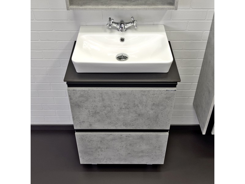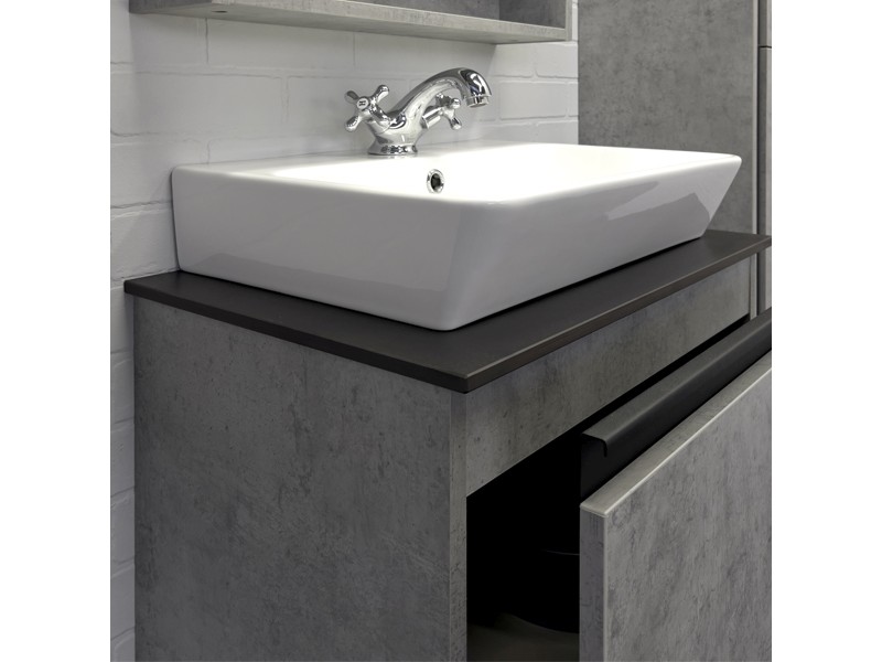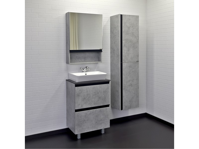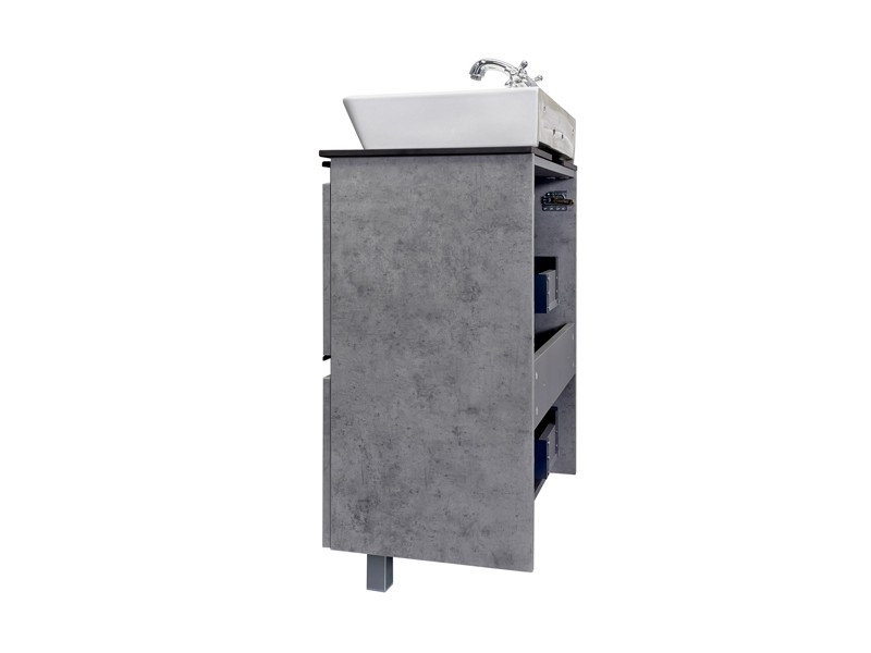 Полуподвесная тумба-умывальник в современном стиле с двумя выкатными ящиками. Ящики оснащены системой плавного закрывания. Тумба укомплектована черными матовыми профильными ручками, столешницей из черного керамогранита и накладной прямоугольной раковиной из санфарфора.