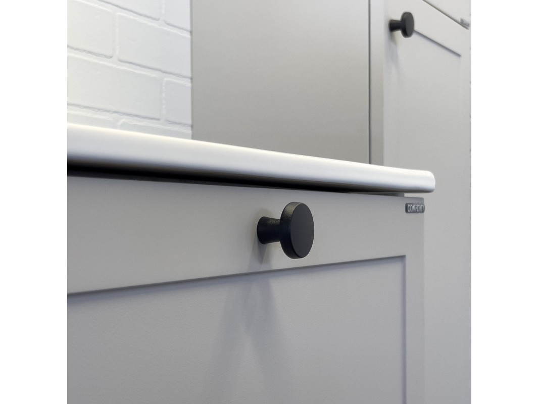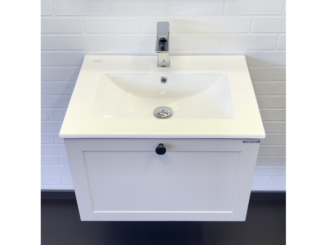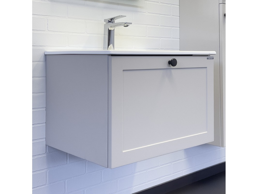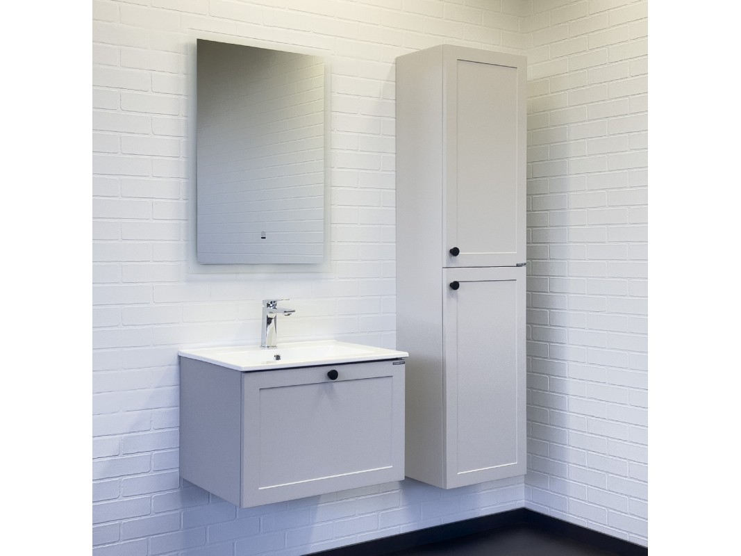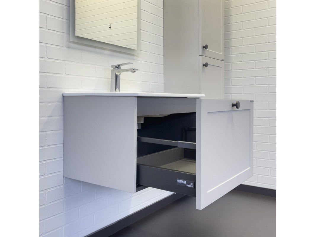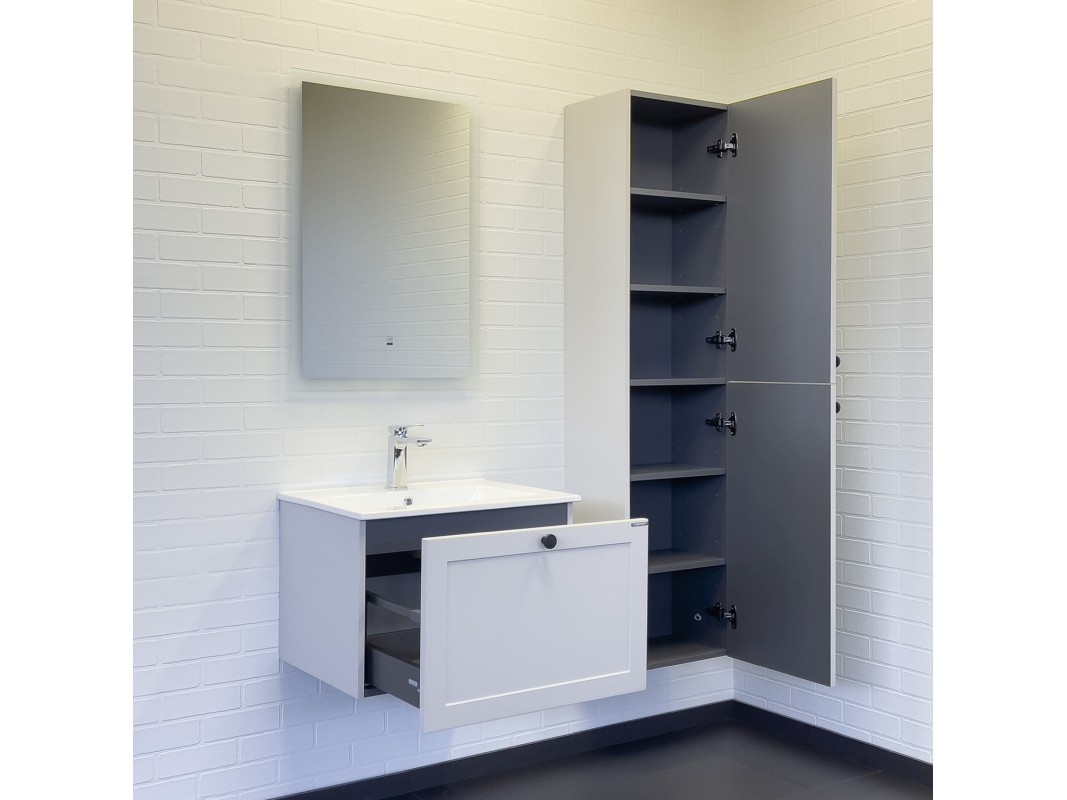 Подвесная тумба с одним выкатным ящиком оборудованным направляющими с системой плавного закрывания. Корпус тумбы изготовлены из влагостойкого ДСП. Фасад тумбы из МДФ фрезерован кантом по периметру. Корпус и фасад тумбы затянуты в матовую пленку цвета "серый шёлк". Тумба подготовлена для подключения водоснабжения снизу и сзади.