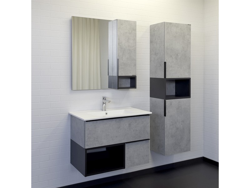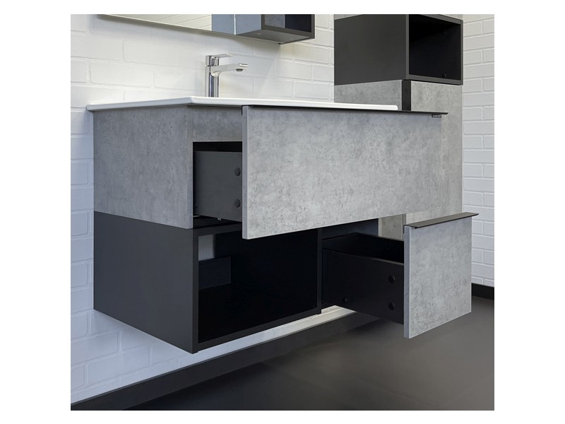 Тумба-умывальник в современном стиле с двумя выкатными ящиками и пространством для открытого хранения. Ящики оснащены системой плавного закрывания. Тумба укомплектована черными матовыми алюминиевыми ручками, столешницей и накладной прямоугольной раковиной из санфарфора.