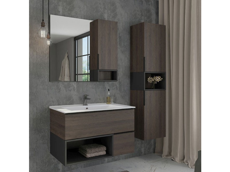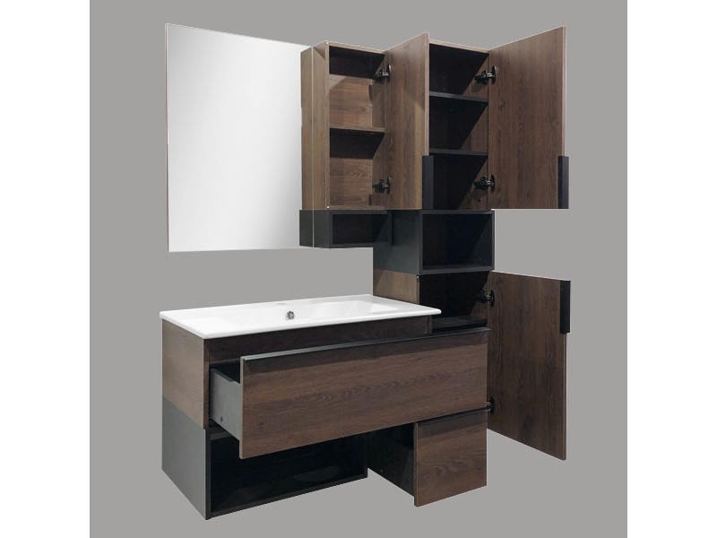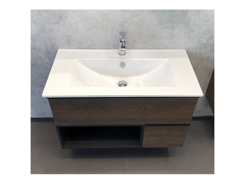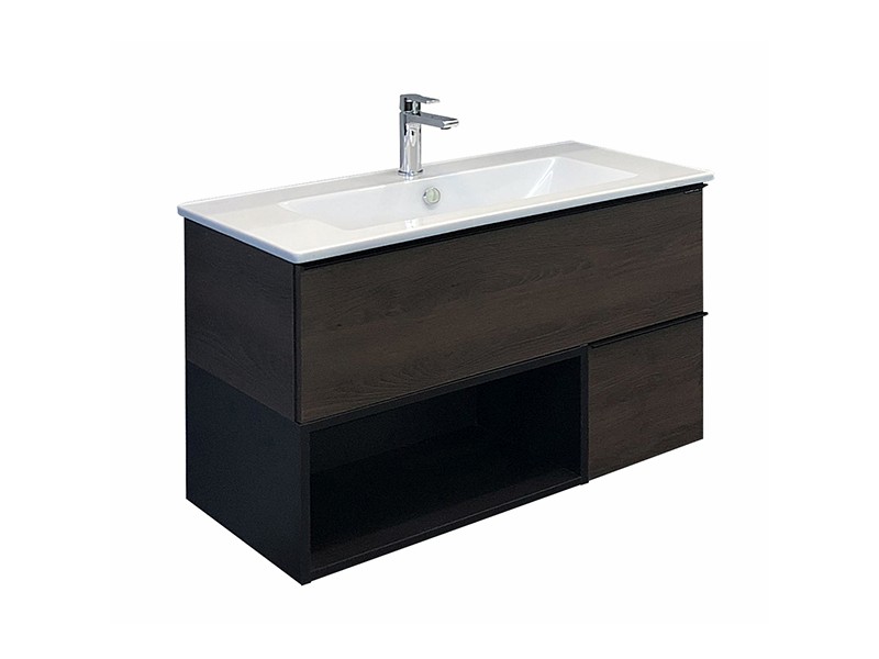 Тумба-умывальник в современном стиле с двумя выкатными ящиками и пространством для открытого хранения. Ящики оснащены системой с плавным закрыванием. Тумба укомплектована черными матовыми алюминиевыми ручками и накладной прямоугольной раковиной из санфарфора.
