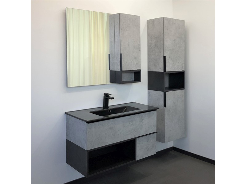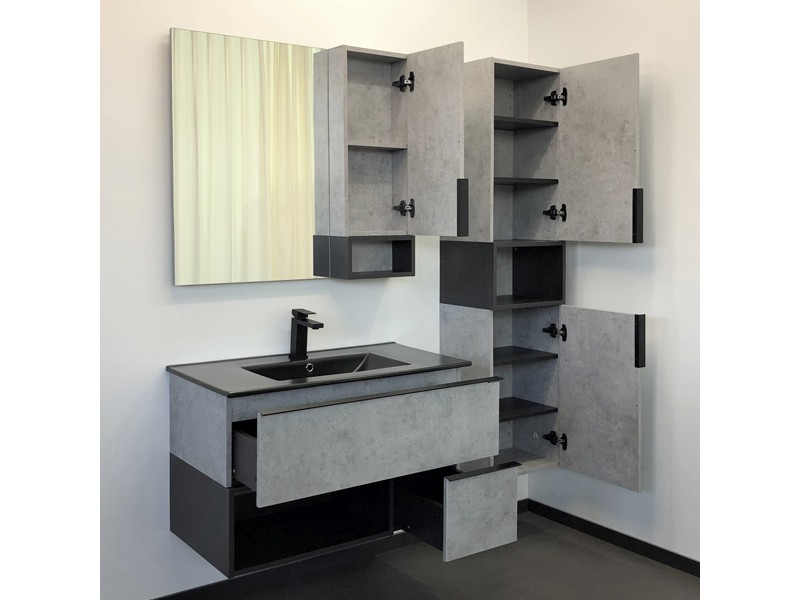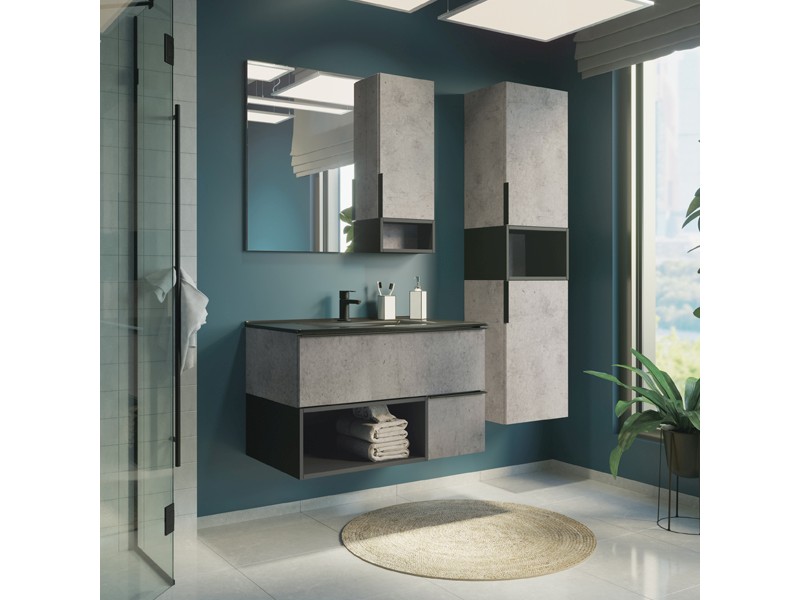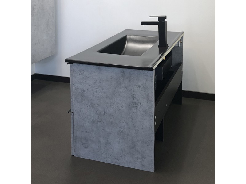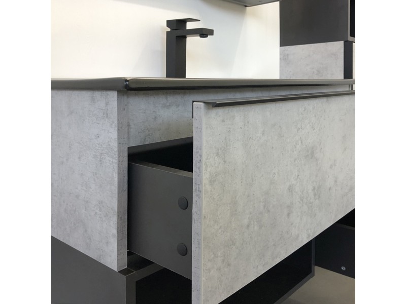 Тумба-умывальник в современном стиле с двумя выкатными ящиками и пространством для открытого хранения. Ящики оснащены направляющими с механизмами с плавного закрывания. Тумба укомплектована черными матовыми алюминиевыми ручками и черной матовой накладной прямоугольной раковиной из санфарфора.