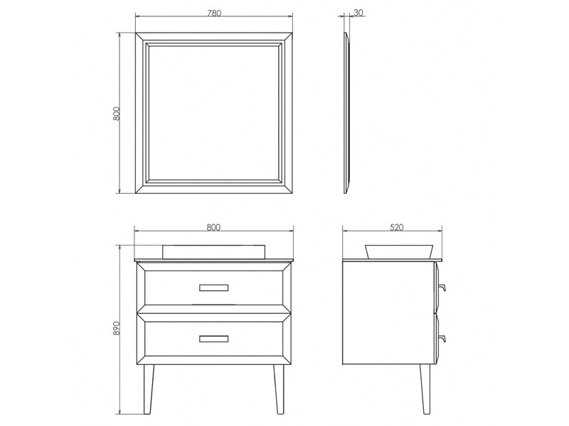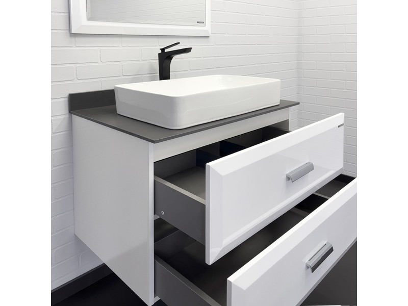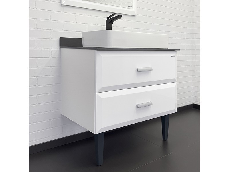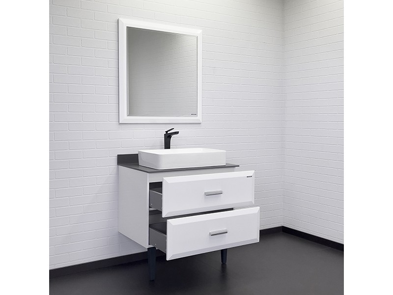 Напольно-подвесная тумба-умывальник с двумя выдвижными ящиками оснащенными системой плавного закрывания. Оригинальные эргономичные металлические ручки. Фасады окрашены белой глянцевой эмалью. Две декоративные ножки из массива натурального дерева.