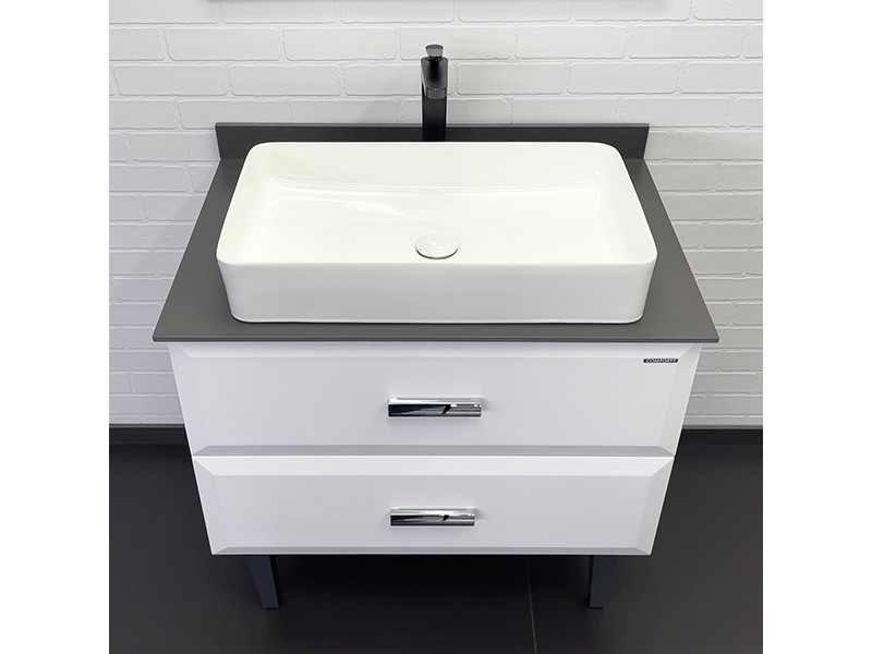 Тумба укомплектована столешницей и бортиком из керамогранита цвета графит и накладной раковиной Comforty 78189. Тумба подготовлена для подключения водоснабжения снизу.