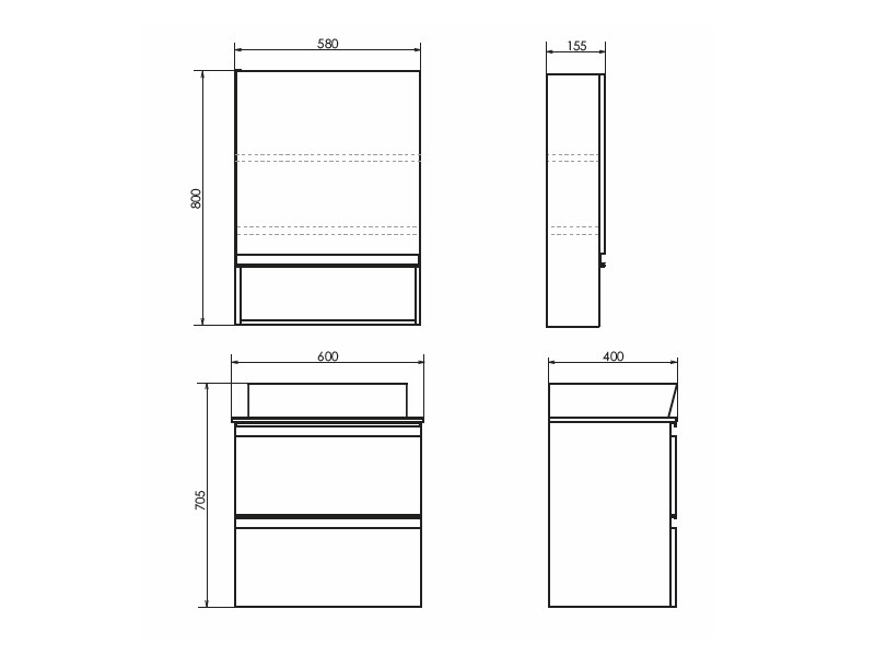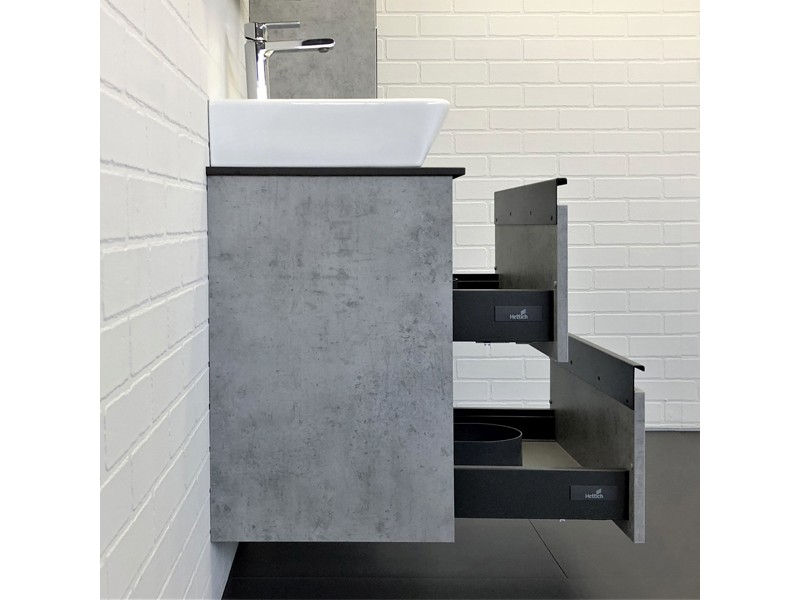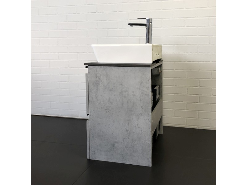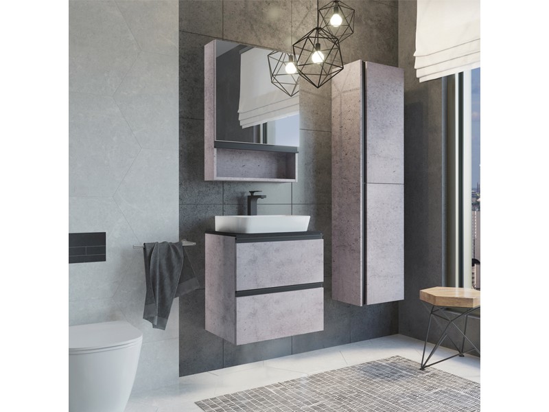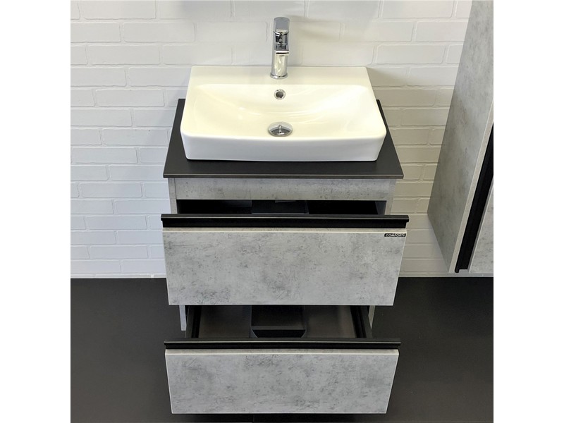 Тумба-умывальник в современном стиле с двумя выкатными ящиками. Ящики оснащены системой плавного закрывания. Тумба укомплектована черными матовыми профильными ручками, столешницей из черного керамогранита и накладной прямоугольной раковиной из санфарфора.