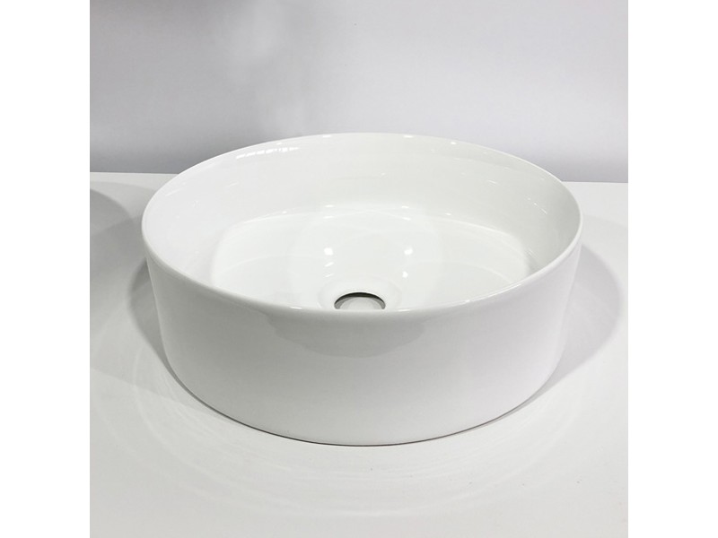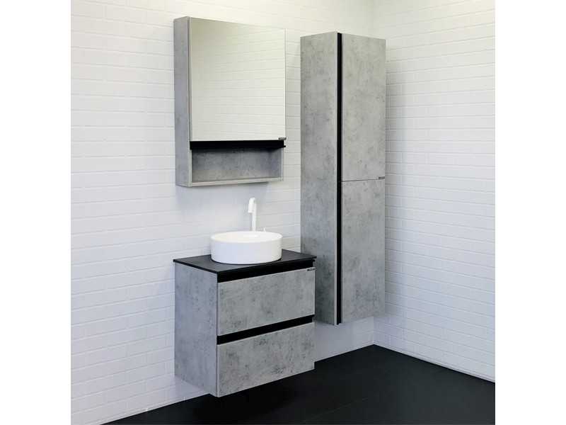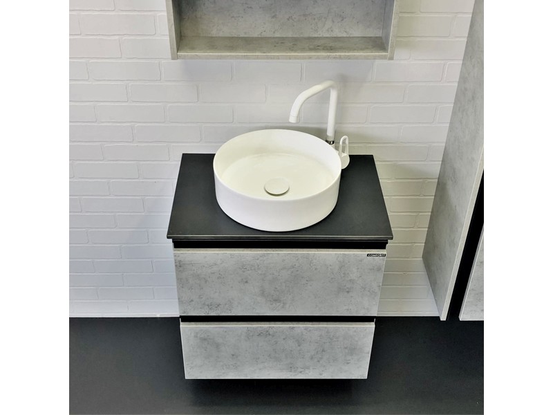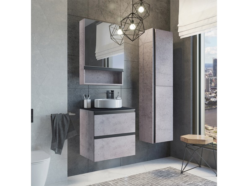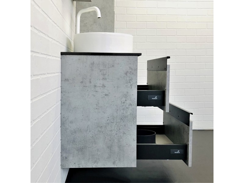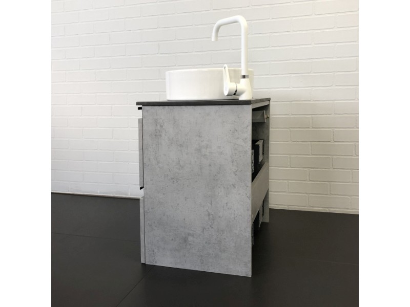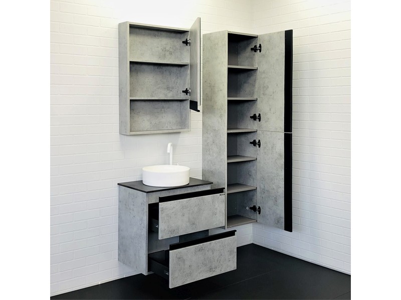 Тумба-умывальник в современном стиле с глубокими выкатными ящиками. Ящики оснащены системой плавного закрывания. Тумба укомплектована черными матовыми профильными ручками, столешницей из черного керамогранита и накладной круглой раковиной из санфарфора.