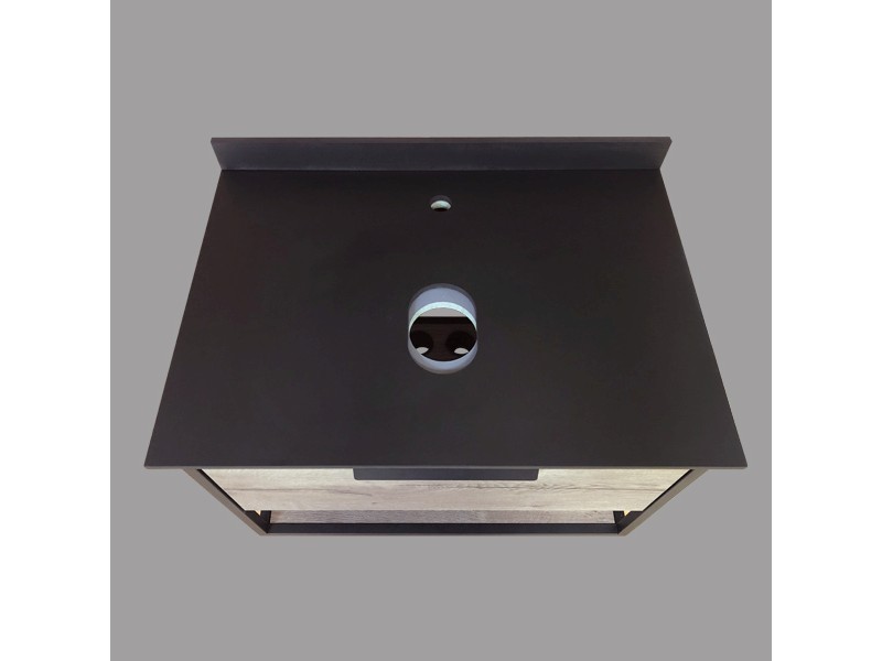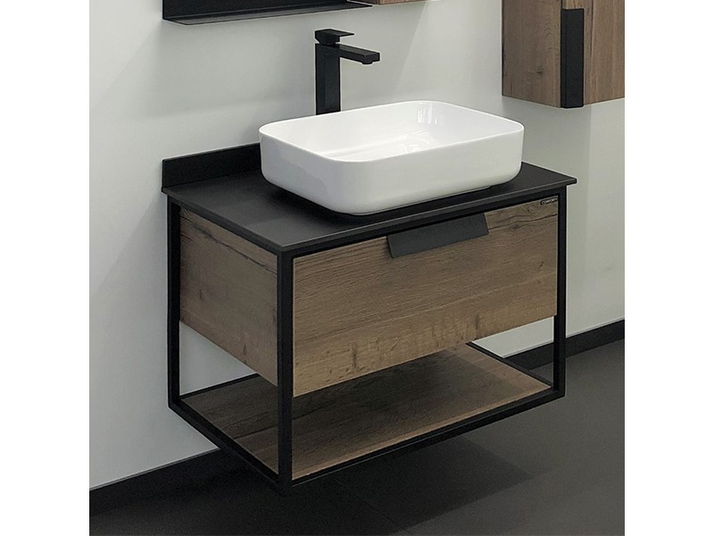 Подвесная тумба-умывальник в стиле лофт с одним выкатным ящиком оснащенным системой плавного закрывания и нижней полкой открытого хранения. В основе тумбы - каркас из стального профиля окрашенный в цвет черный муар.
