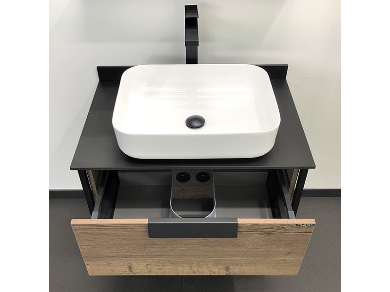 Комплектация: накладная раковина Comforty T-Y9378, столешница и пристенный плинтус из черного керамогранита. Тумба подготовлена для подключения водоснабжения снизу.