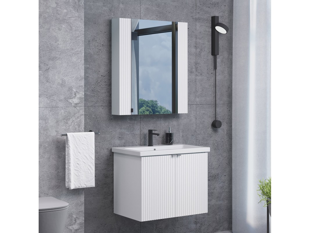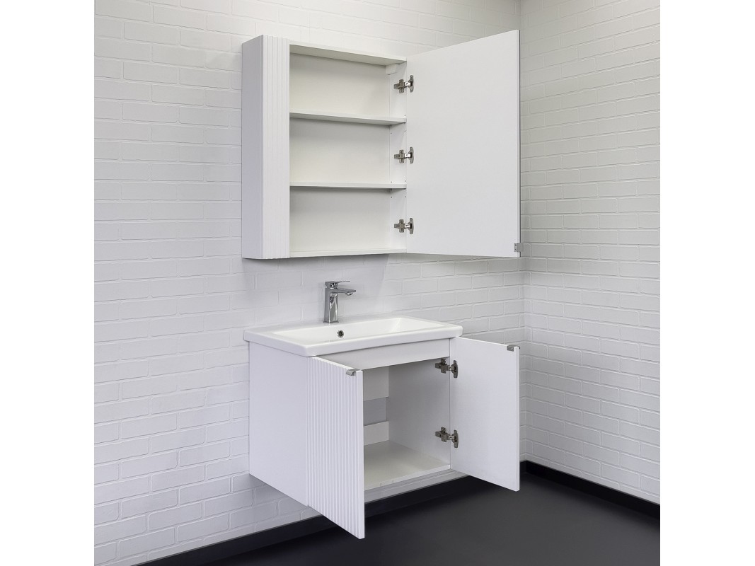 Подвесная тумба-умывальник с двумя распашными створками декорированными вертикальной фрезеровкой. Створки оснащены петлями плавного закрывания. За створками одна полка. В модели применяется матовая плёнка белого цвета с эффектом Soft-Touch.