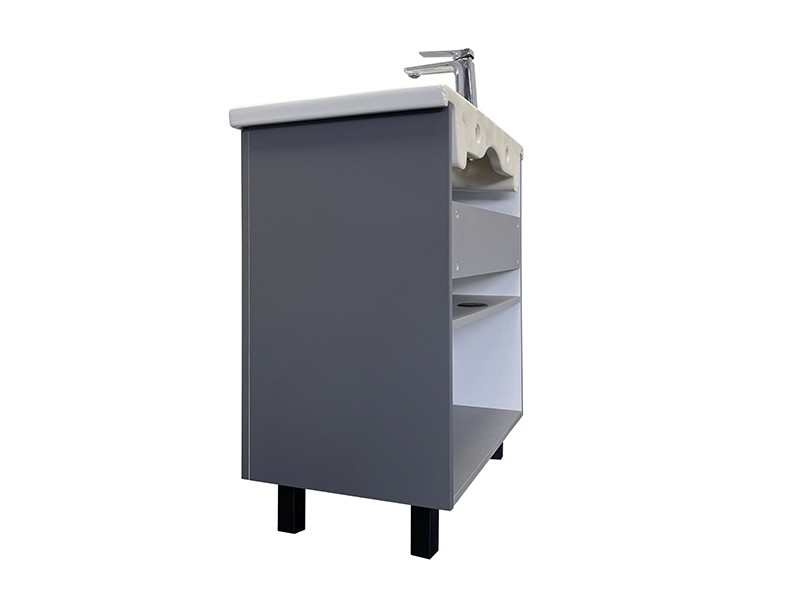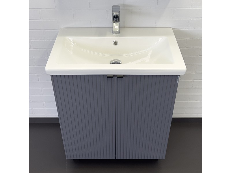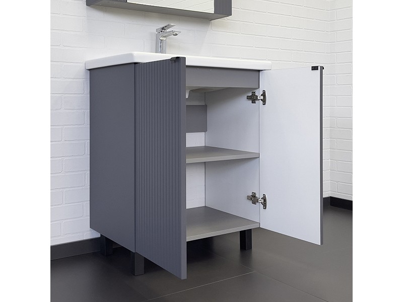 Напольная тумба-умывальник с двумя распашными створками декорированными вертикальной фрезеровкой. Створки оснащены петлями плавного закрывания. За створками одна полка. В модели применяется плёнка с эффектом Soft-Touch.