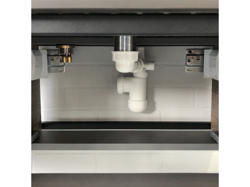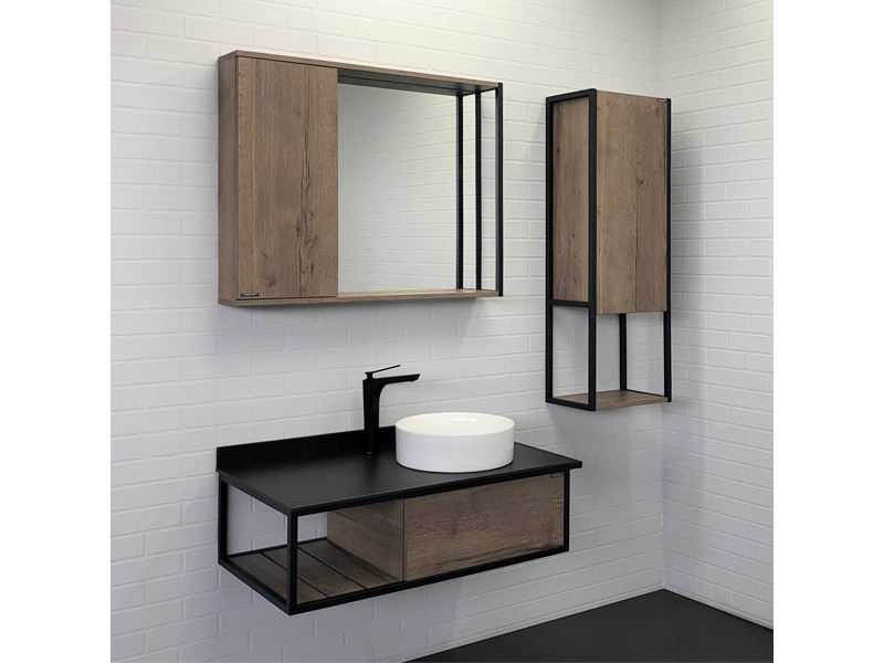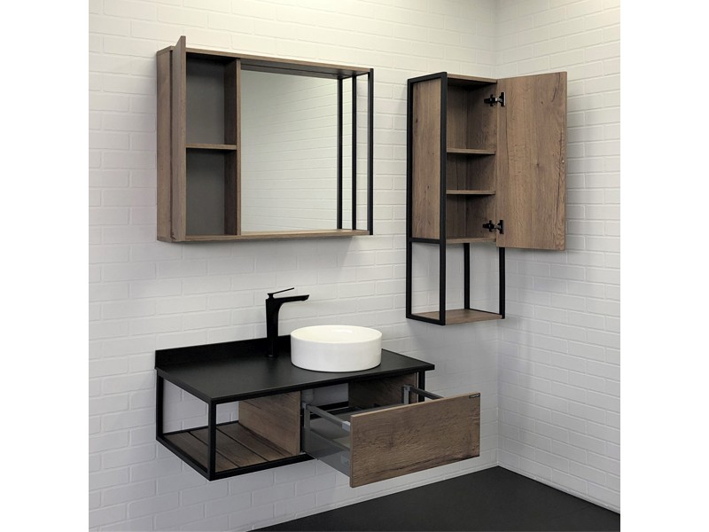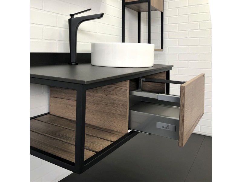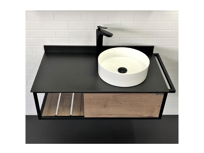 В основе тумбы - каркас из стального профиля окрашенный в цвет черный муар. В каркас интегрирован боковой полотенцедержатель. Керамическая круглая раковина чаша установлена слева на столешнице из черного керамогранита. Боковые стенки и фасад ящика изготовлены из влагостойкого ЛДСП цвета Дуб темный. Ящик тумбы оборудован механизмом push-to-open - открытие при нажатии.