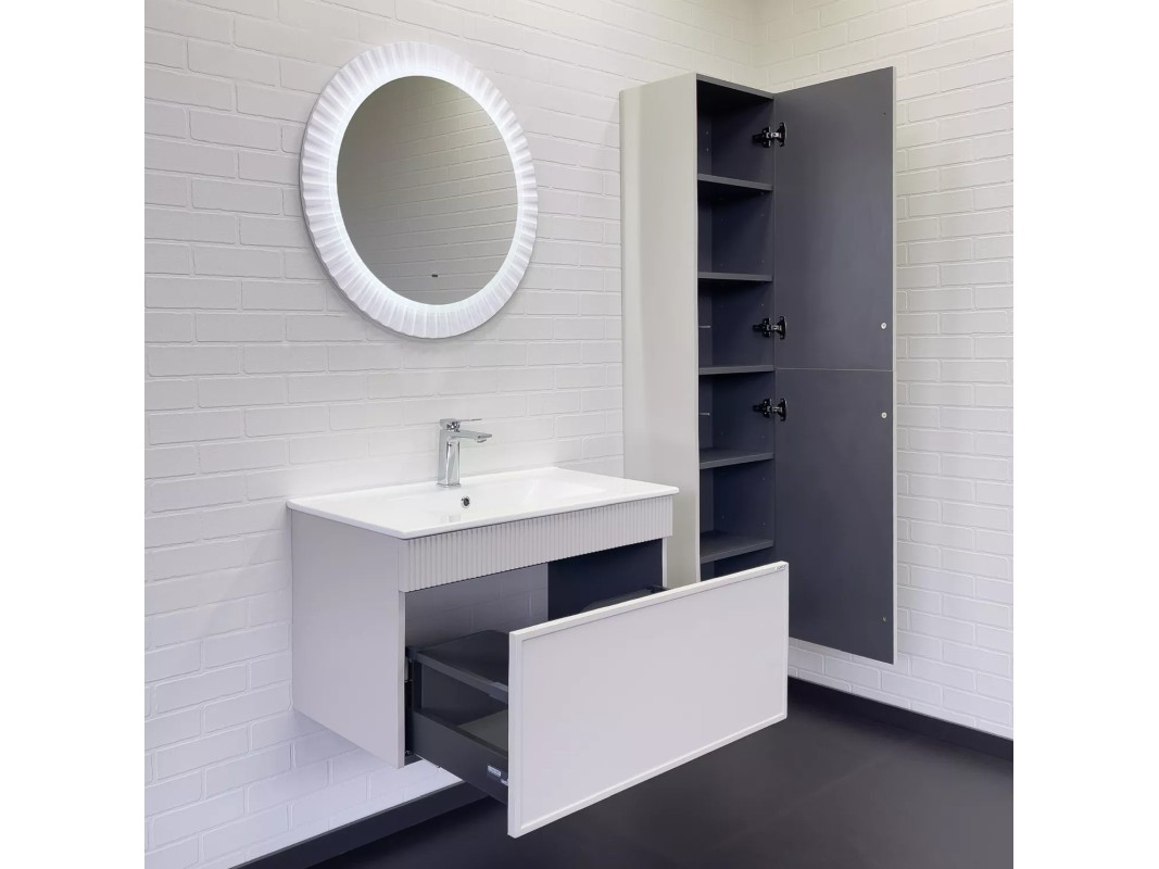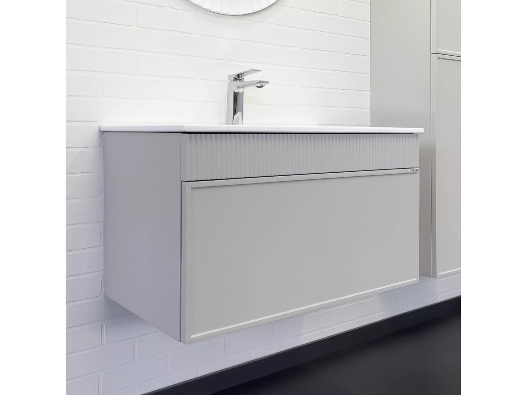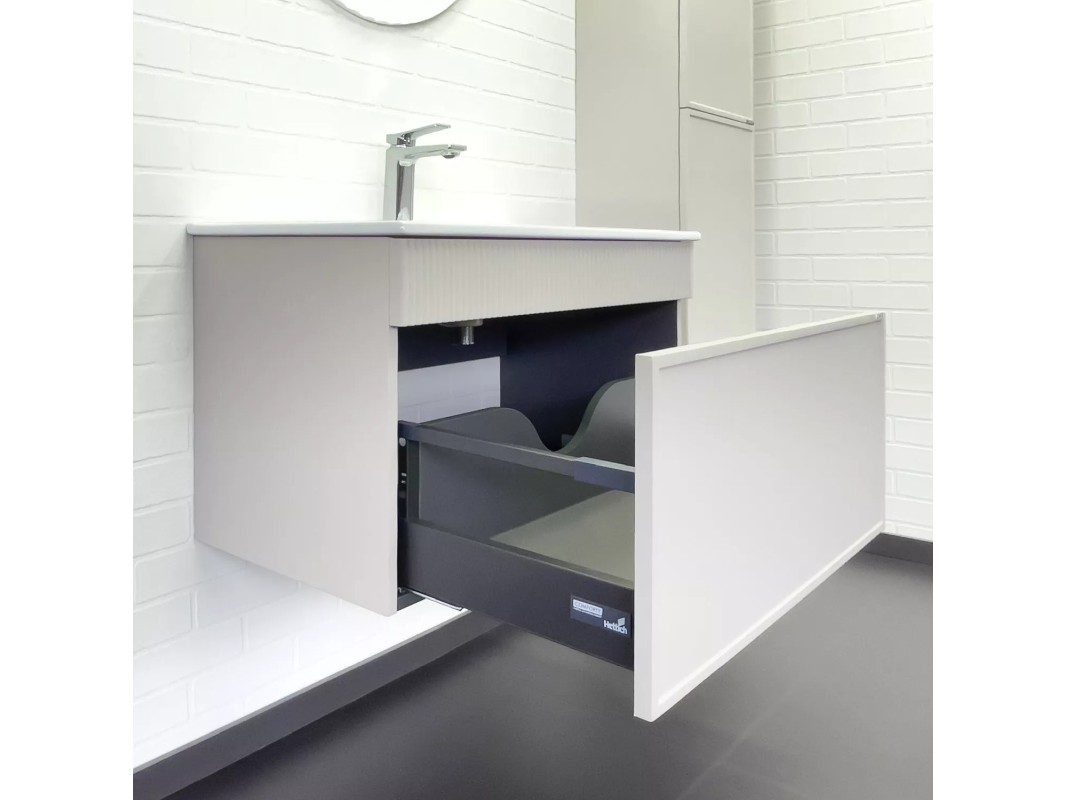 Подвесная тумба с одним большим выкатным ящиком оборудованным направляющими с системой плавного закрывания. Корпус тумбы изготовлены из влагостойкого ЛДСП. Фасад тумбы из МДФ фрезерован кантом по периметру. Подпорная царга фрезерована вертикальным узором. Корпус и фасад тумбы затянуты в матовую пленку цвета "серый шёлк". Тумба подготовлена для подключения водоснабжения снизу и сзади.
