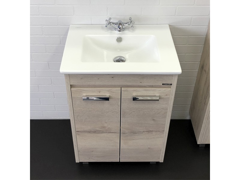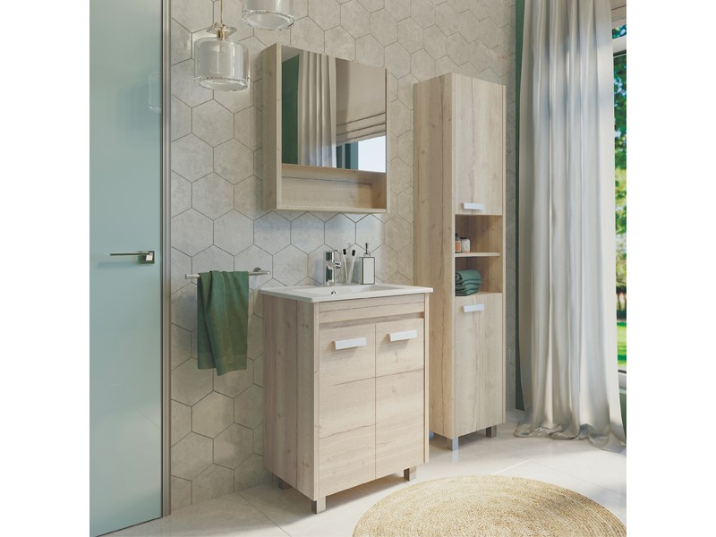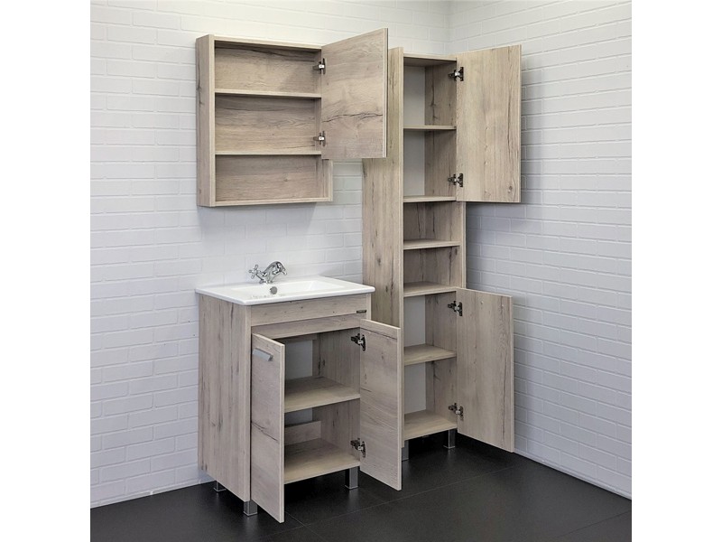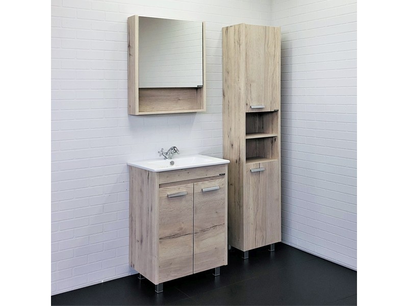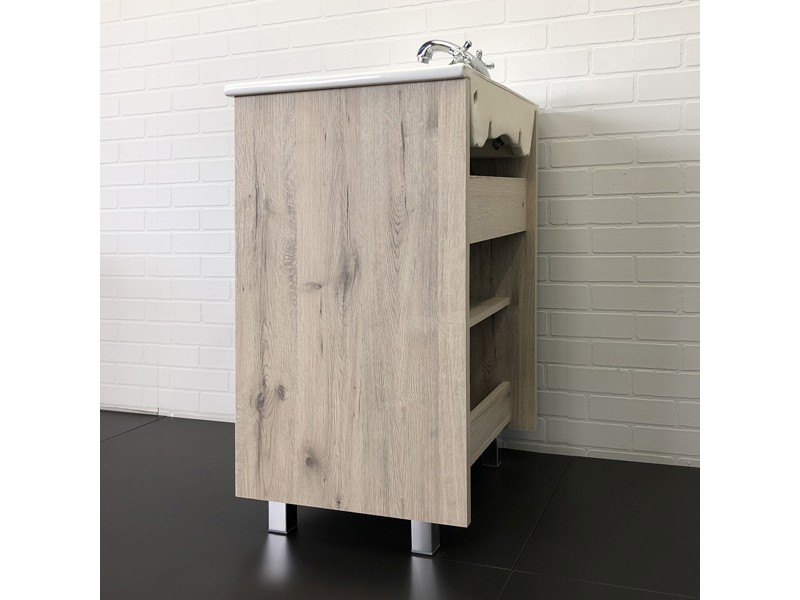 Тумба с двумя створками, оснащенными петлями с плавным закрыванием. Корпус и фасады тумбы выполнены из влагостойкого ЛДСП цвета "дуб темный". Тумба подготовлена для подключения водоснабжения снизу.