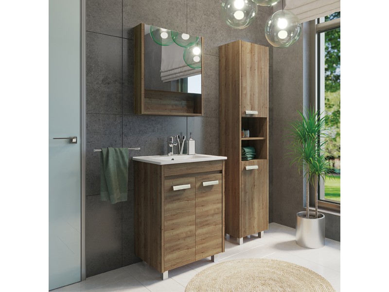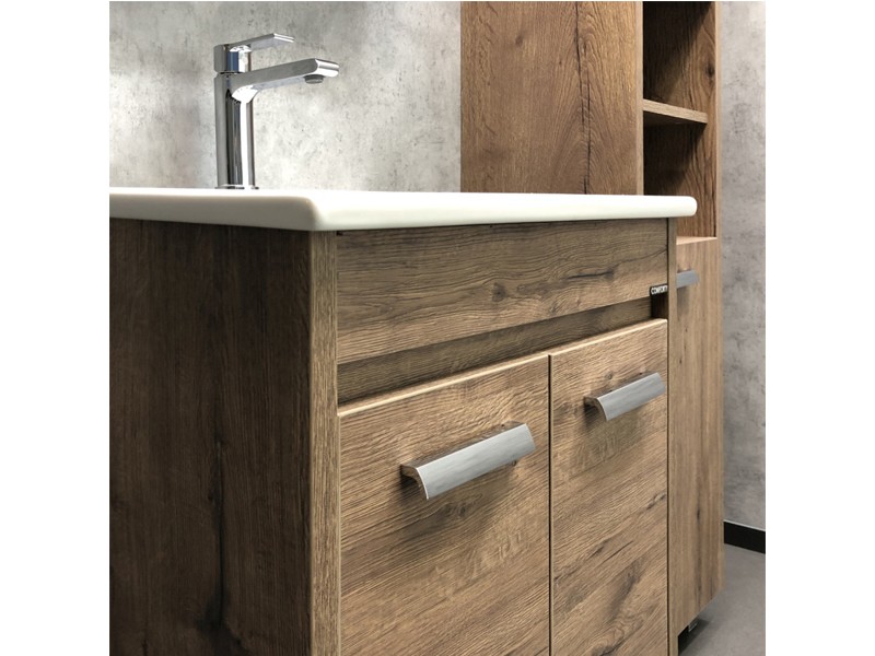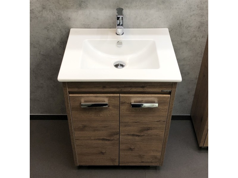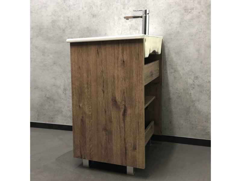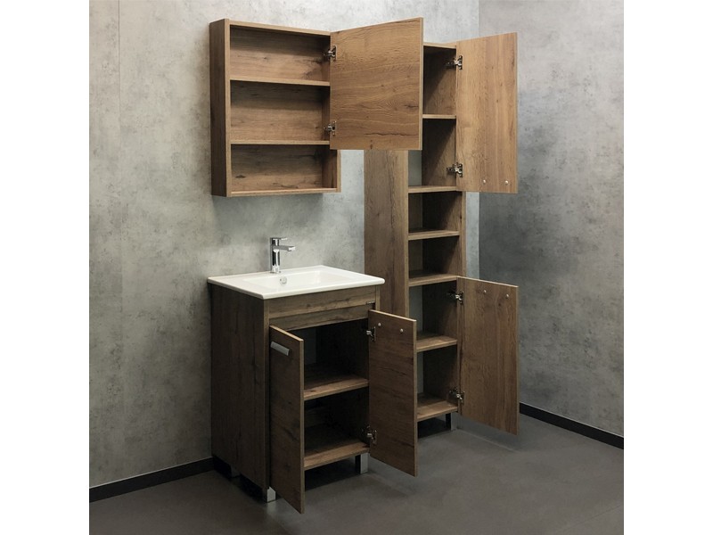 Тумба с двумя створками, оснащенными петлями с плавным закрыванием. Корпус и фасады тумбы выполнены из влагостойкого ЛДСП цвета "дуб темный". Тумба подготовлена для подключения водоснабжения снизу.