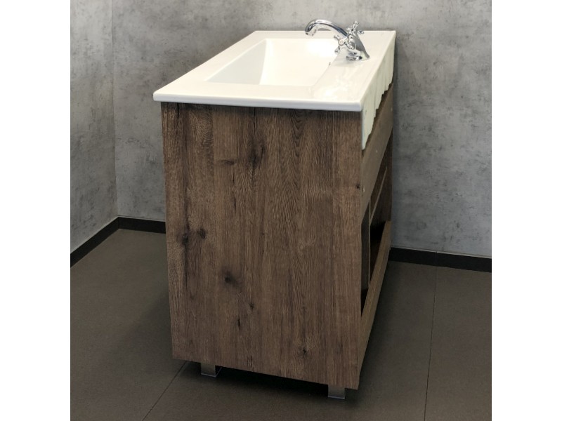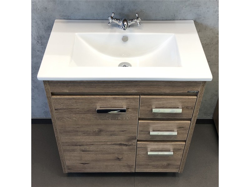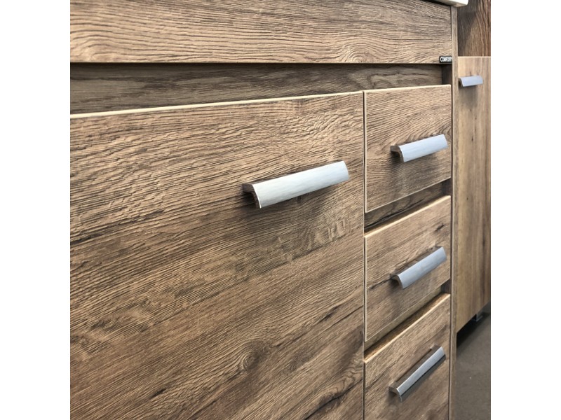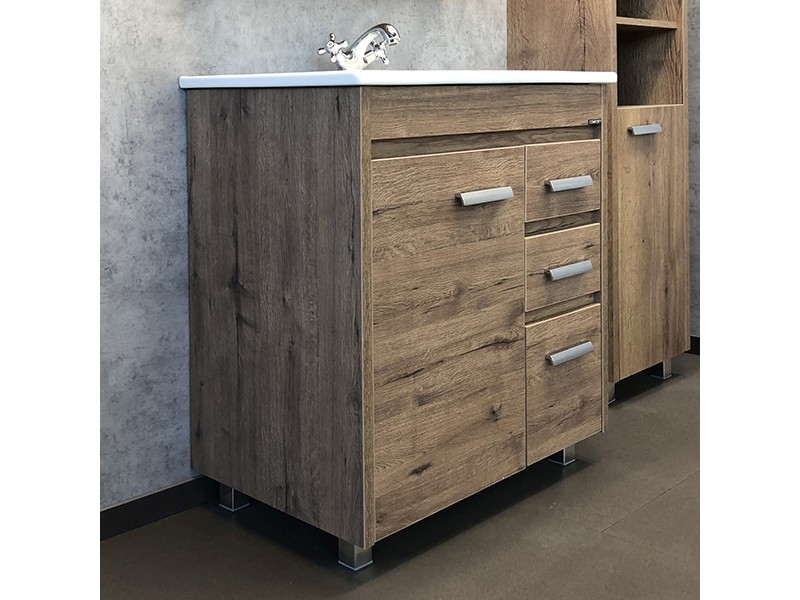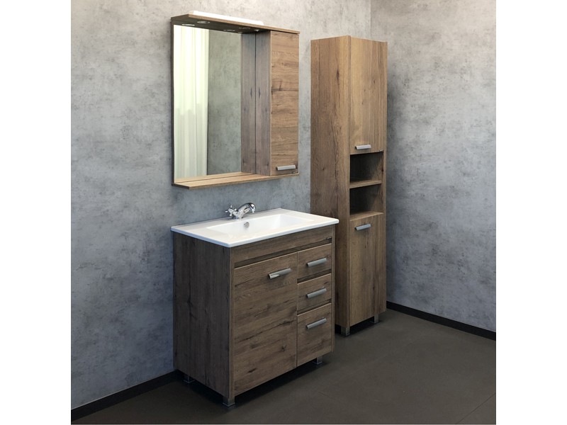Напольная тумба-умывальник шириной 75 см с одной распашной створкой и тремя выдвижными ящиками. Створка оснащена петлями с плавным закрыванием. Корпус и фасады тумбы выполнены из влагостойкого лдсп декорированного под натуральную древесину - дуб темный.