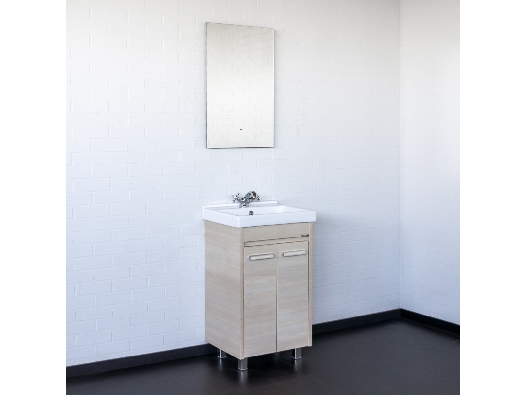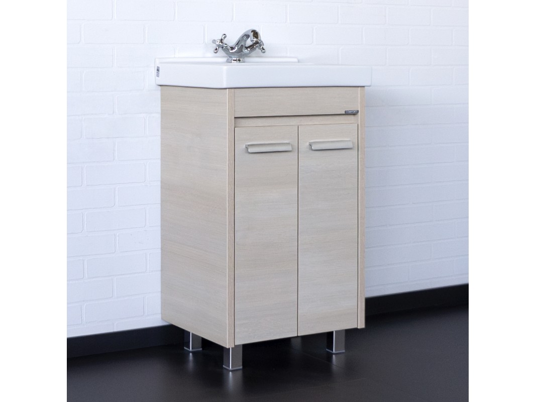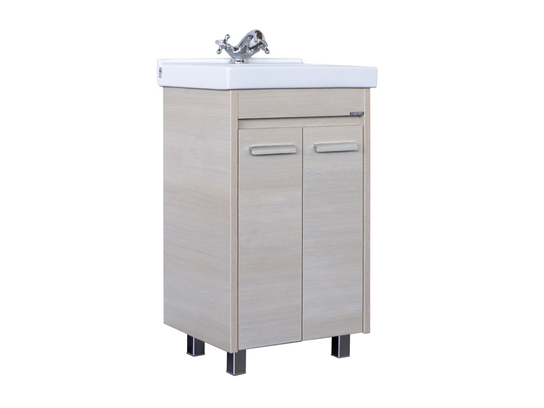 Тумба с двумя створками, оснащенными петлями с плавным закрыванием. Корпус и фасады тумбы выполнены из влагостойкого ЛДСП цвета "сосна лоредо". Тумба подготовлена для подключения водоснабжения снизу.