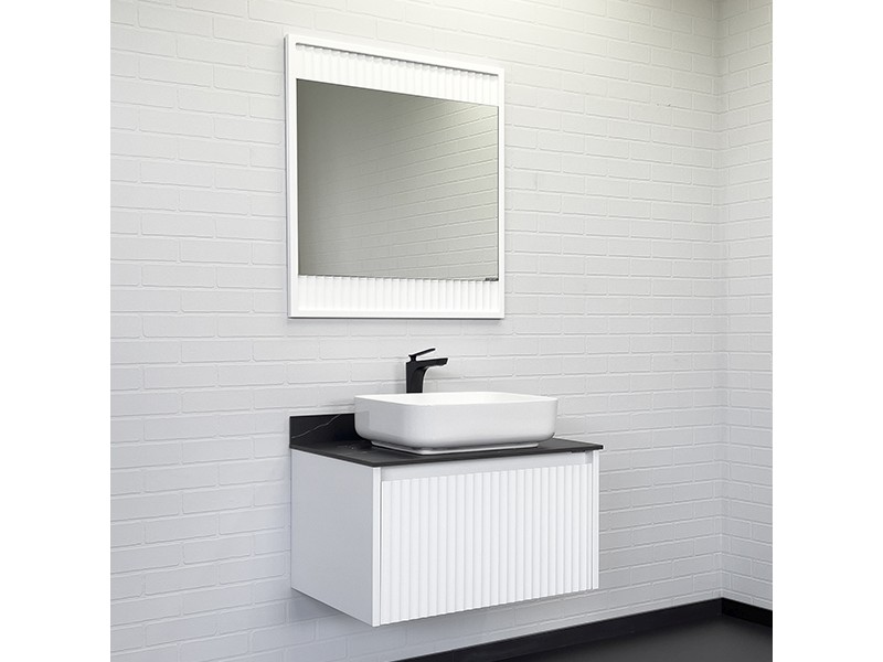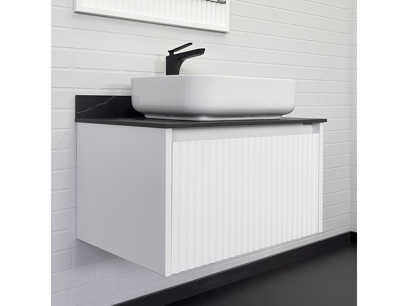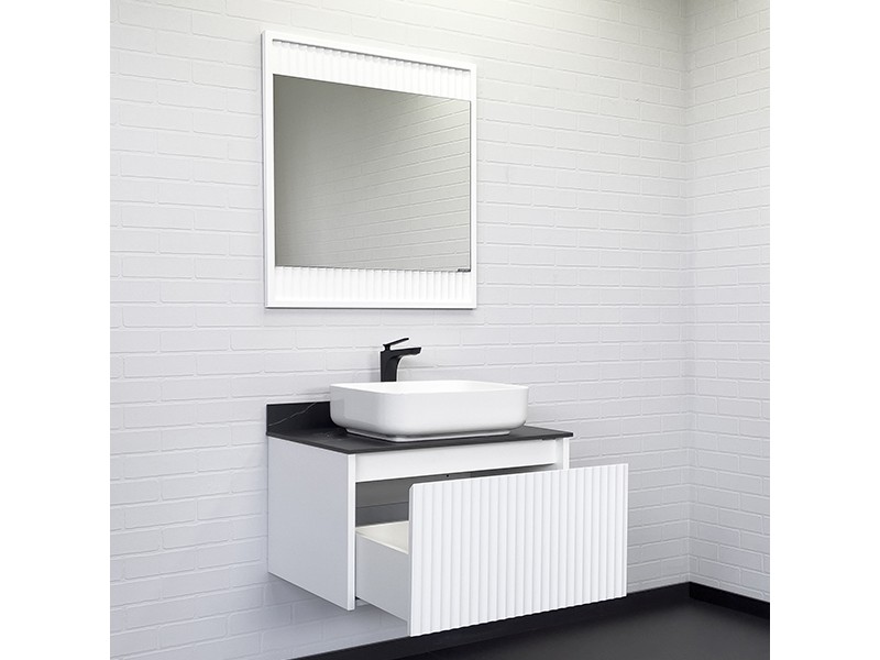 Фасад тумбы из МДФ фрезерован геометрическим узором с имитацией волны и окрашен белой матовой эмалью.