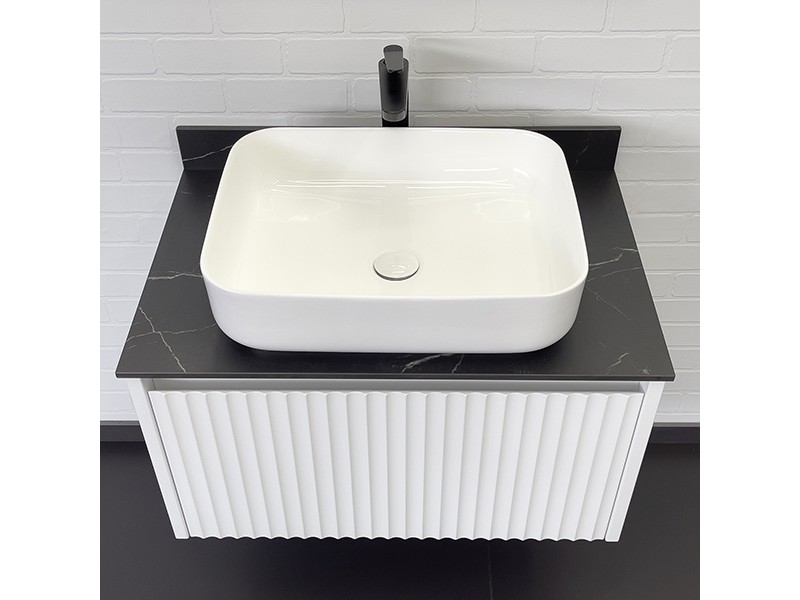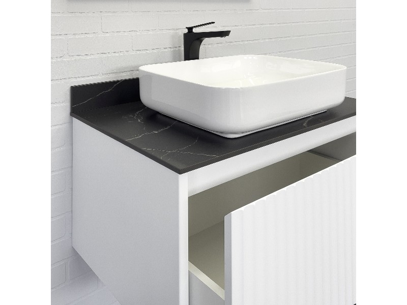 Комплектация: накладная керамическая раковина Comforty T-Y9378, черная матовая столешница из керамогранита под мрамор Калакатта Блэк с бортиком.