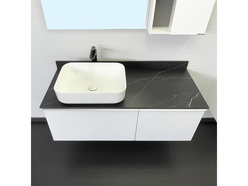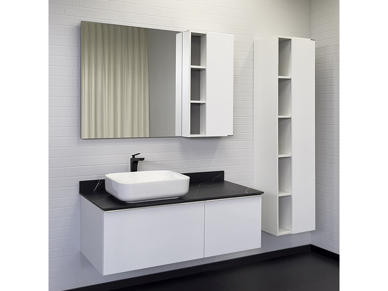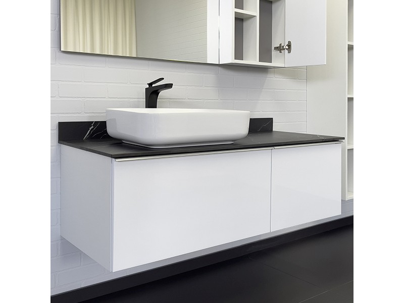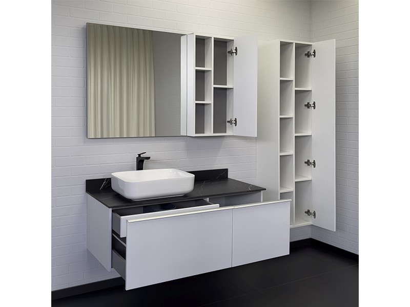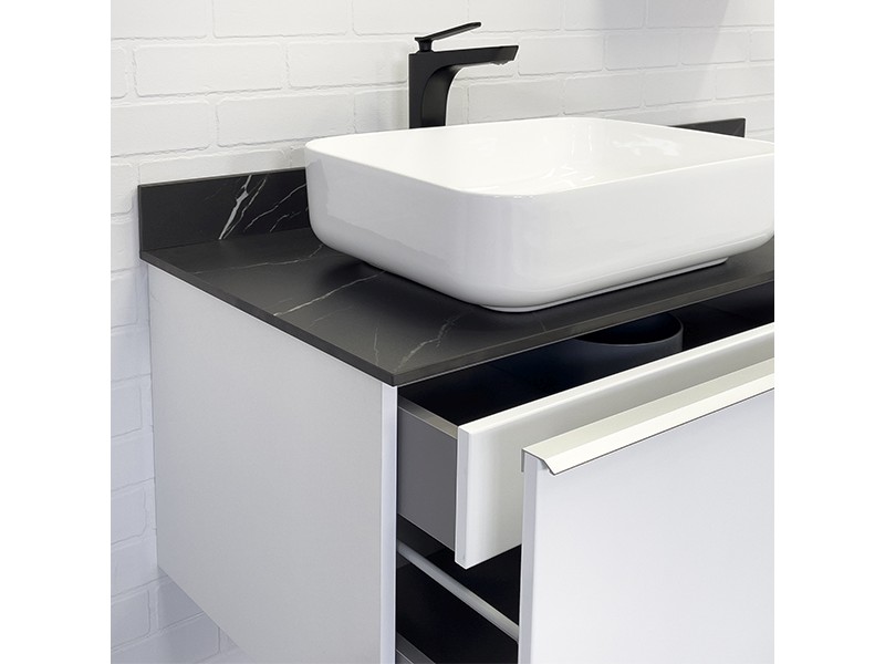 Широкая подвесная тумба-умывальник в современном стиле с двумя выкатными ящиками. Ящики оснащены системой с плавным закрыванием. За правым фасадом скрывается внутренний ящик оснащенный системой push-to-open (открытие при нажатии). Тумба укомплектована столешницей и плинтусом из керамогранита под мрамор Калакатта Блэк и накладной прямоугольной раковиной.