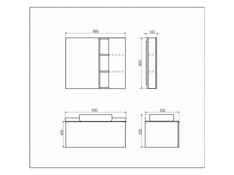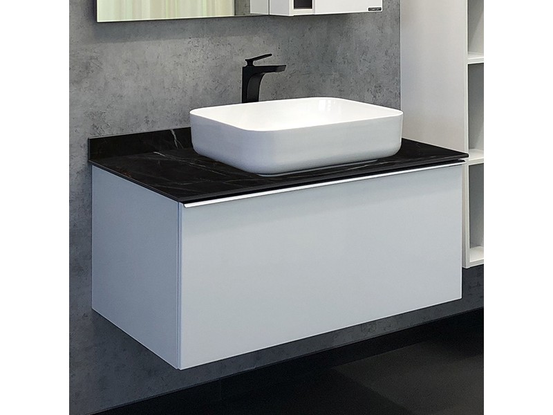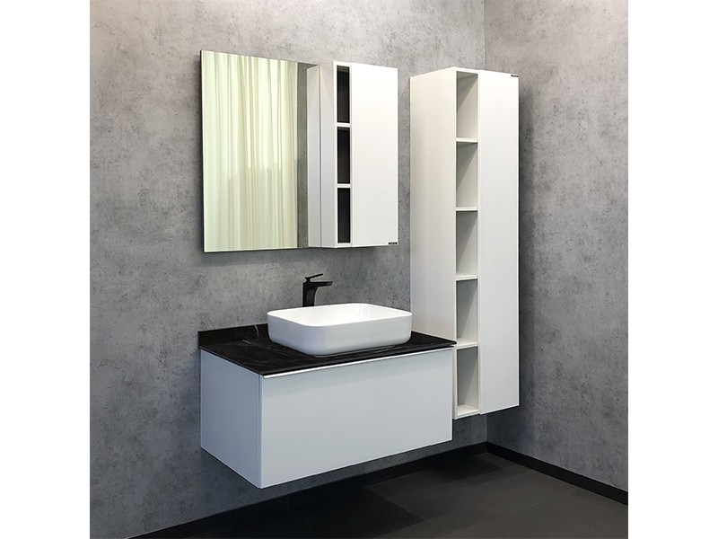 Подвесная тумба-умывальник в современном стиле с выкатным ящиком оснащенным системой с плавного закрывания. За основным фасадом скрывается внутренний ящик оснащенный системой push-to-open (открытие при нажатии). Тумба укомплектована столешницей и бортиком из керамогранита под мрамор Калакатта Блэк и накладной прямоугольной раковиной. Фасады покрыты белой глянцевой эмалью.