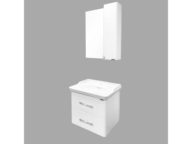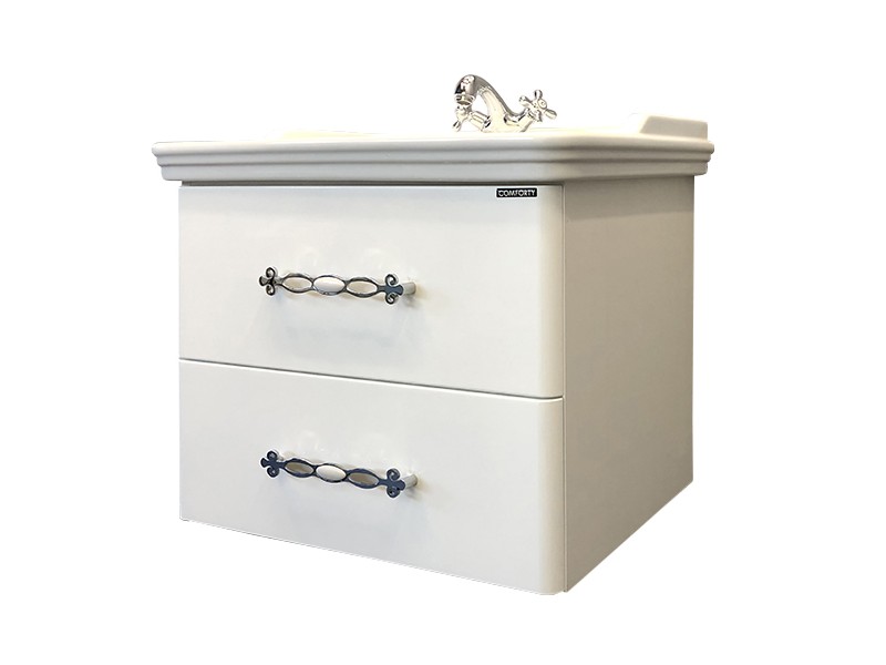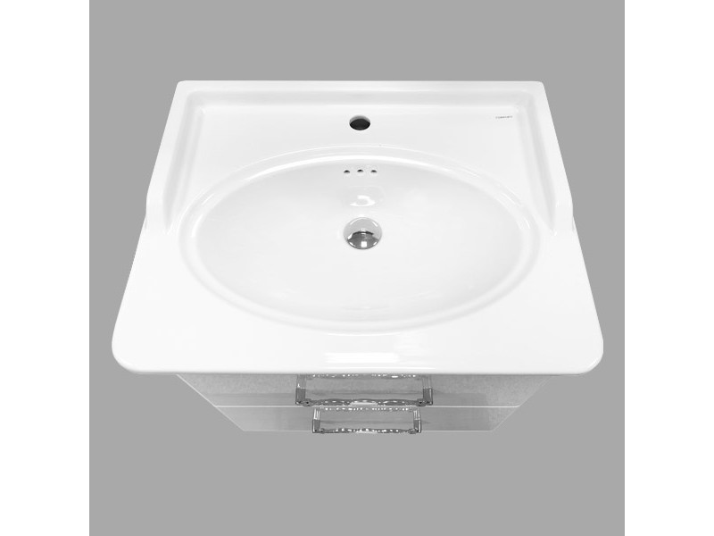 Тумба-умывальник с двумя выкатными ящиками, оснащенными системой плавного закрывания. Фасады выполнены из МДФ и покрыты белой глянцевой эмалью. Раковина с овальной чашей и оригинальными отверстиями перелива.