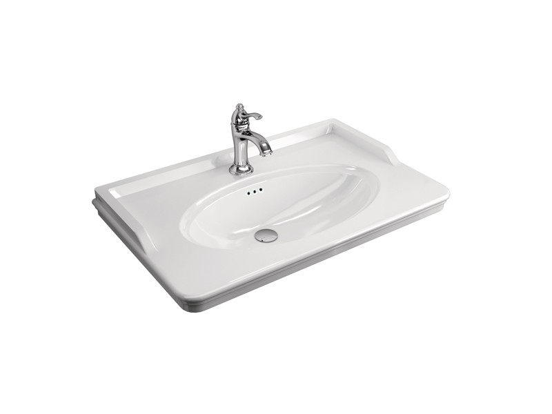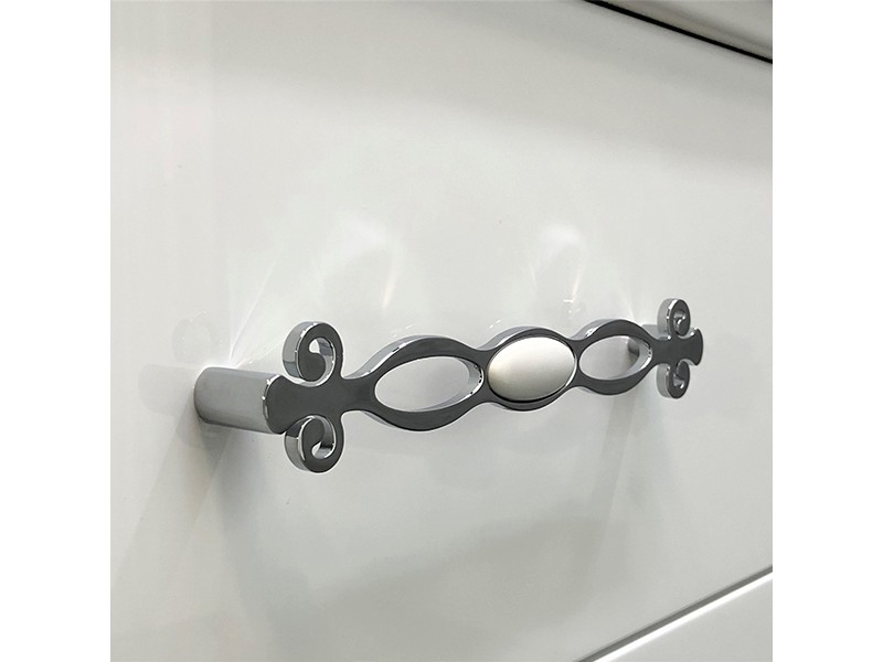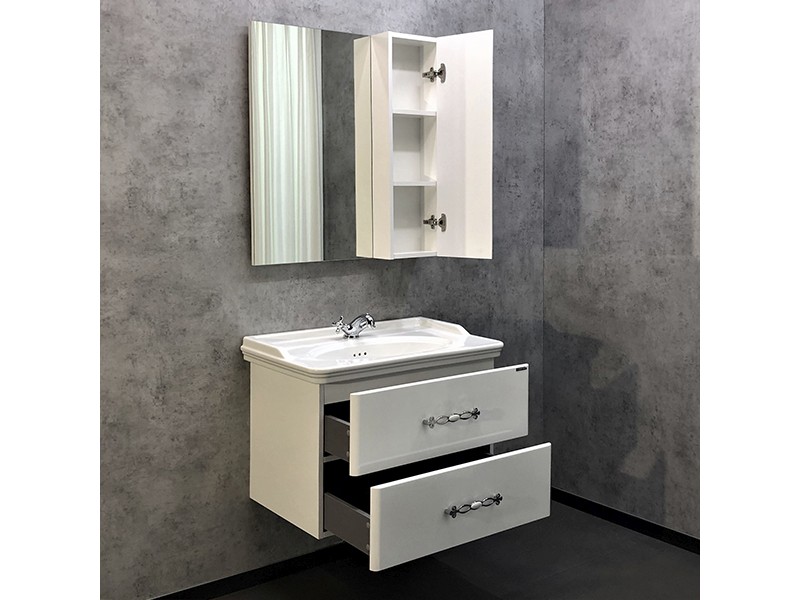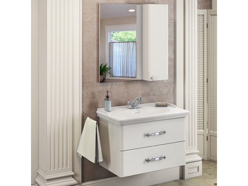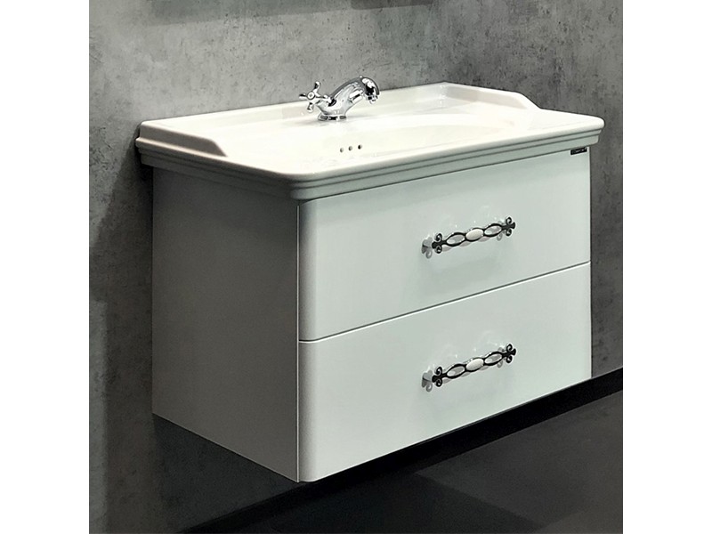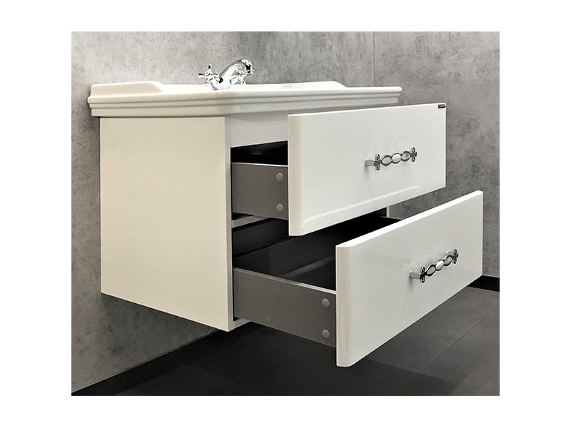Тумба-умывальник с двумя выкатными ящиками, оснащенными системой плавного закрывания. Фасады выполнены из МДФ и покрыты белой глянцевой эмалью. Раковина столешница с овальной чашей и оригинальными отверстиями перелива.