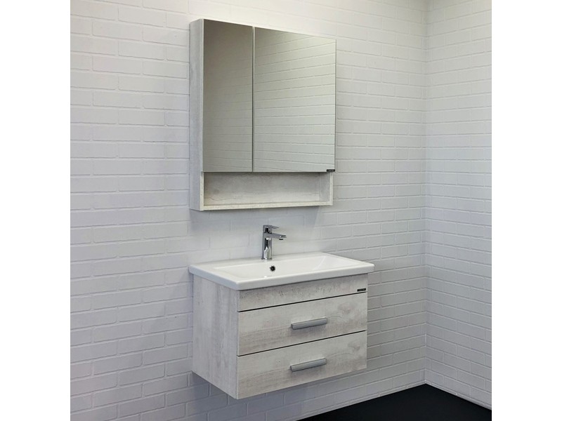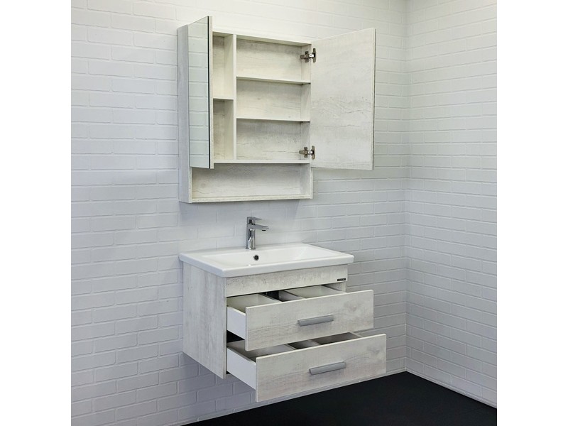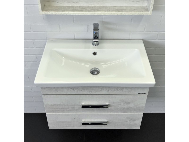 Подвесная тумба-умывальник с двумя выкатными ящиками. Ящики оснащены доводчиками для плавного закрывания. Корпус и фасады тумбы из влагостойкого ДСП актуальной фактуры "Дуб белый" с имитацией натурального дерева. Тумба укомплектована прямоугольной раковиной из санитарного фарфора и четырьмя ножками.