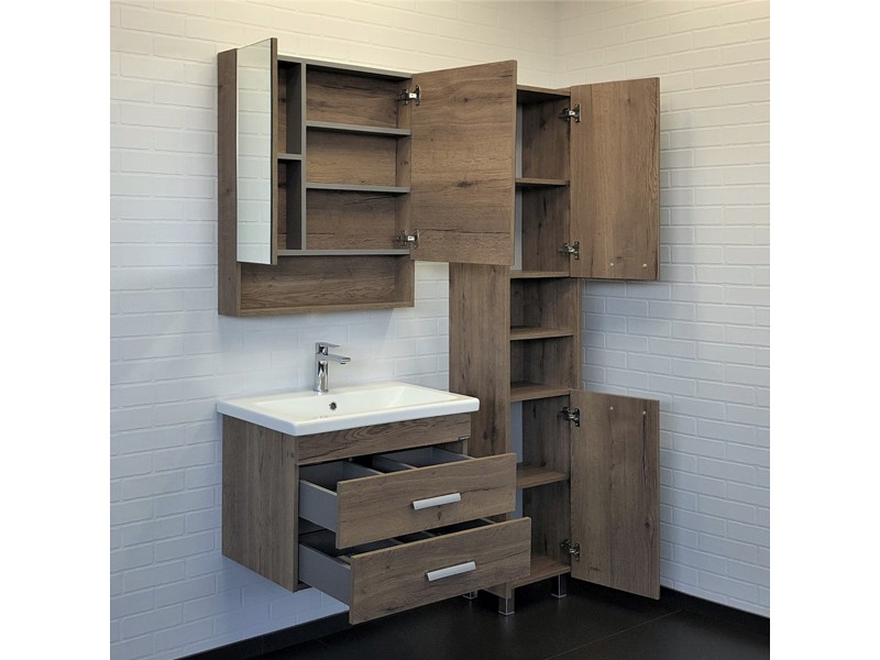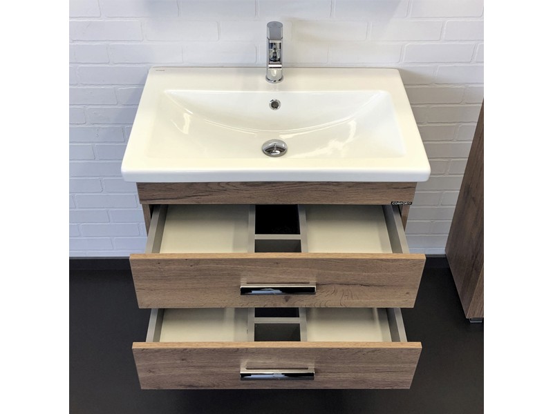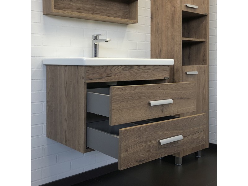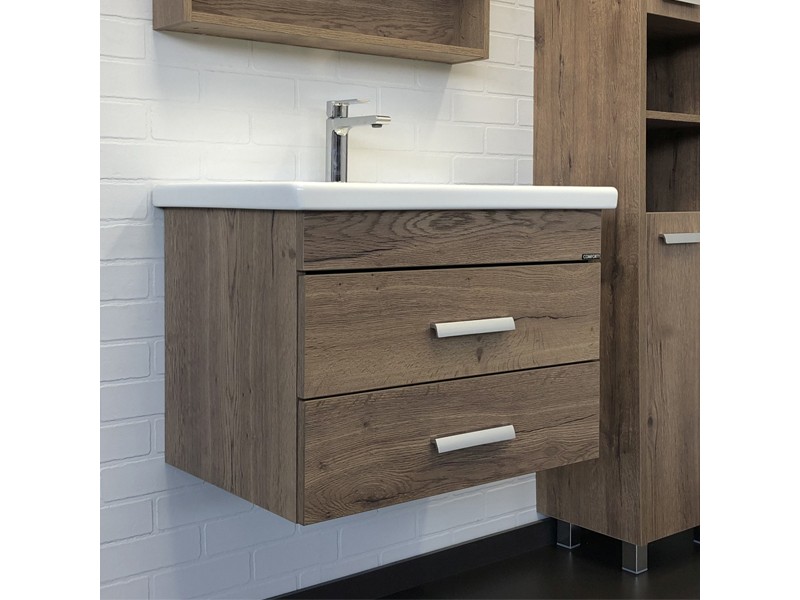 Подвесная тумба-умывальник с двумя выкатными ящиками. Ящики оснащены доводчиками для плавного закрывания. Корпус и фасады тумбы из влагостойкого ДСП актуальной фактуры "Дуб темный" с имитацией натурального дерева. Тумба укомплектована прямоугольной раковиной из санитарного фарфора и четырьмя ножками.