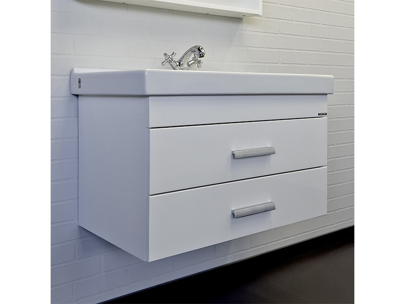 Подвесная тумба-умывальник с двумя выкатными ящиками. Ящики оснащены доводчиками для плавного закрывания. Корпус и фасады тумбы из влагостойкого ДСП окрашенного белой глянцевой эмалью. Тумба укомплектована прямоугольной раковиной самарского завода из 100% санитарного фарфора.