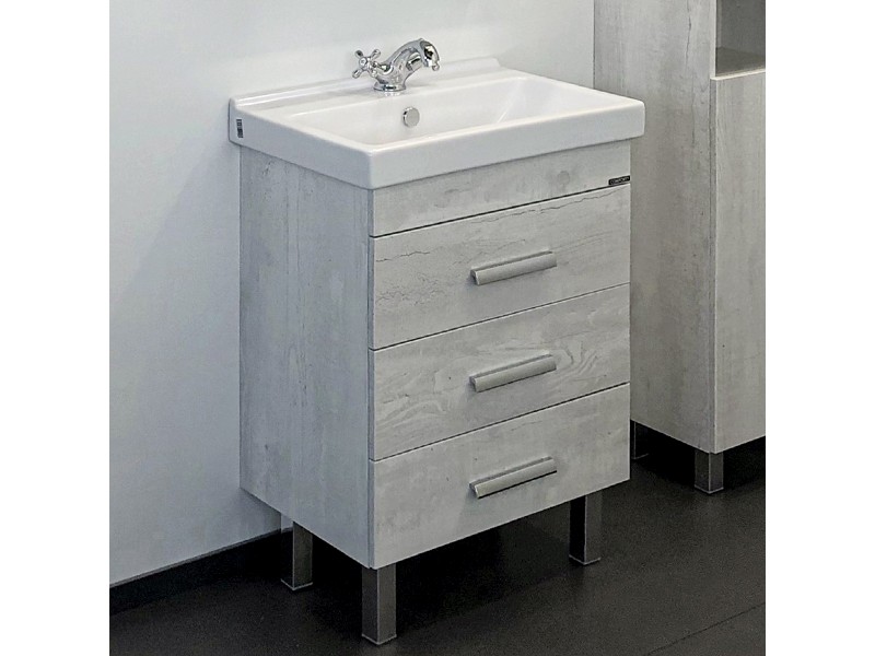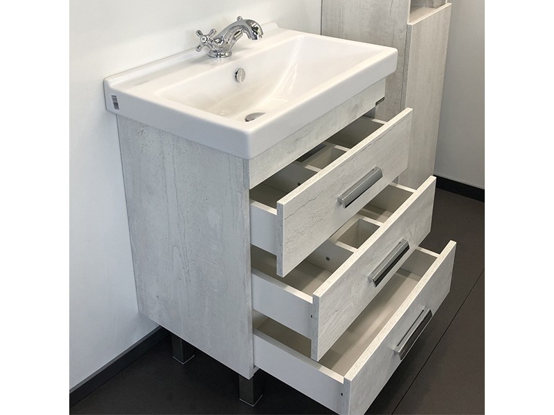 Напольная тумба с тремя выдвижными ящиками, оснащенным системой плавного закрывания. Тумба подготовлена для подключения водоснабжения снизу.