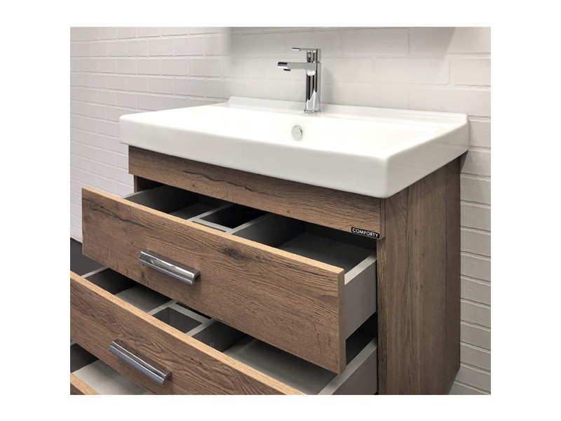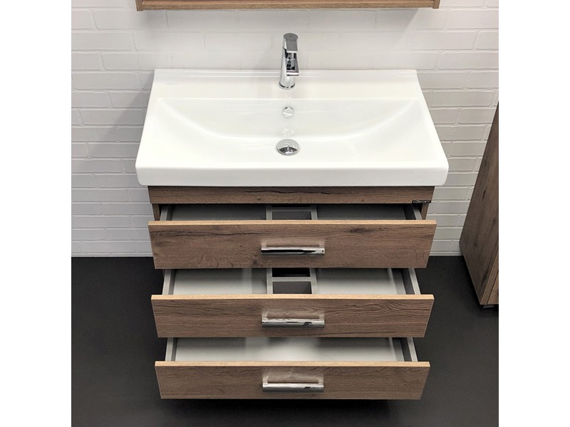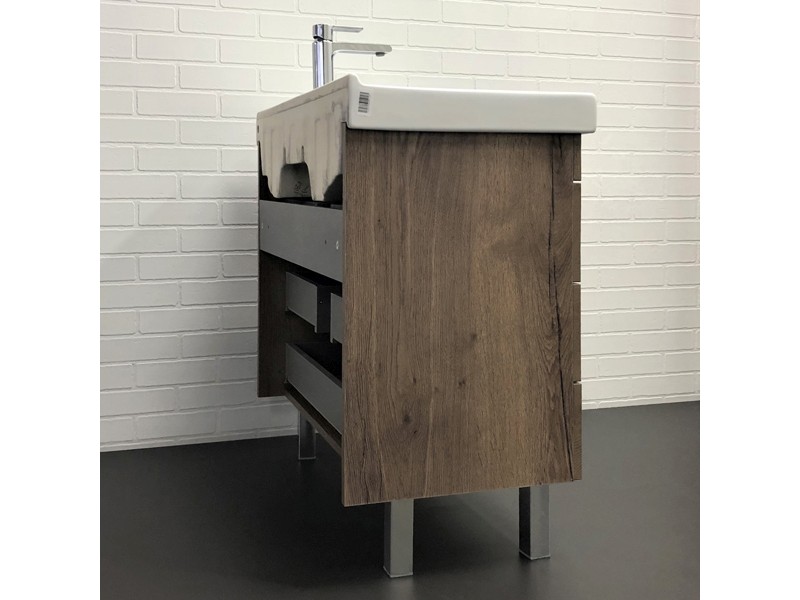 Напольная тумба-умывальник с тремя выкатными ящиками. Ящики оснащены доводчиками для плавного закрывания. Корпус и фасады тумбы из влагостойкого ДСП актуальной фактуры "Дуб темный" с имитацией натурального дерева. Тумба укомплектована прямоугольной раковиной самарского завода из 100% санитарного фарфора.